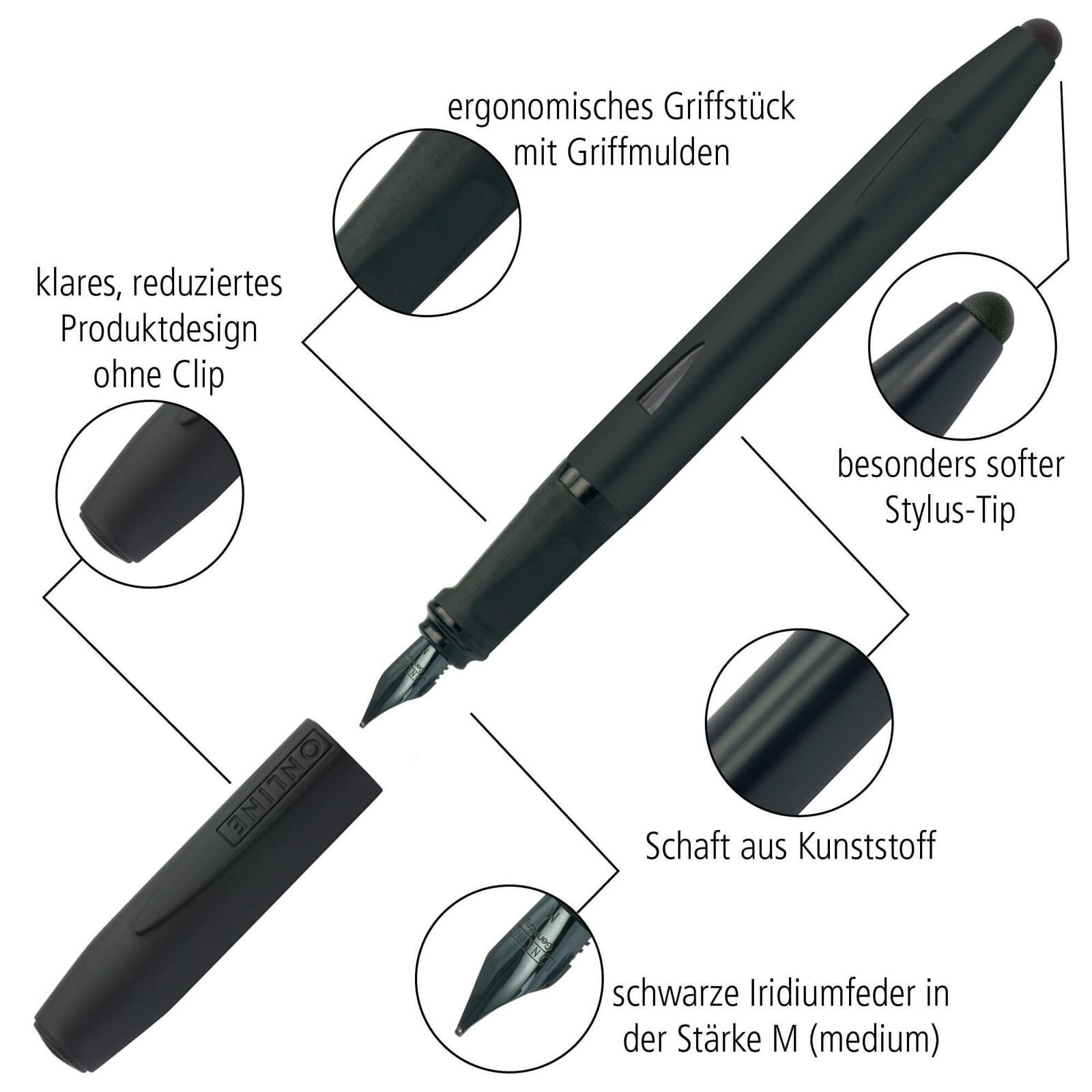 Stelle dich dem Online Füller Switch Nero M Patronenfüller in eleganter schwarzer Farbe vor. Dieser hochwertige Füller aus dem Hause ONLINE® ist speziell für Rechtshänder konzipiert. Mit einem Gehäuse in edlem Schwarz und einer ergonomischen Griffform bietet er nicht nur ein elegantes Erscheinungsbild, sondern auch maximalen Schreibkomfort. Das Modell Switch Nero M besticht nicht nur durch sein zeitloses Design, sondern auch durch seine Funktionalität. Geliefert wird dieser exklusive Füller inklusive einer praktischen Kombi-Tintenpatrone in der Farbe Blau. Dank seiner Nachfüllbarkeit mit Standard-Tintenpatronen ist er nicht nur umweltfreundlich, sondern auch äußerst ökonomisch in der Anwendung. Erwecke deine Schreibkreativität zum Leben und genieße ein sanftes und präzises Schreiberlebnis mit der blauen Schreibfarbe. Mit dem ONLINE® Füller Switch Nero M Patronenfüller kannst du mühelos deinen Gedanken freien Lauf lassen und gleichzeitig deinen individuellen Stil unterstreichen. Überzeuge dich selbst von der Qualität und dem Komfort dieses exquisiten Füllers und erlebe Schreibgenuss auf einem neuen Level. Lass deine Worte mit Leichtigkeit auf das Papier fließen und genieße das Schreibgefühl, das dich inspirieren wird.Technische Daten