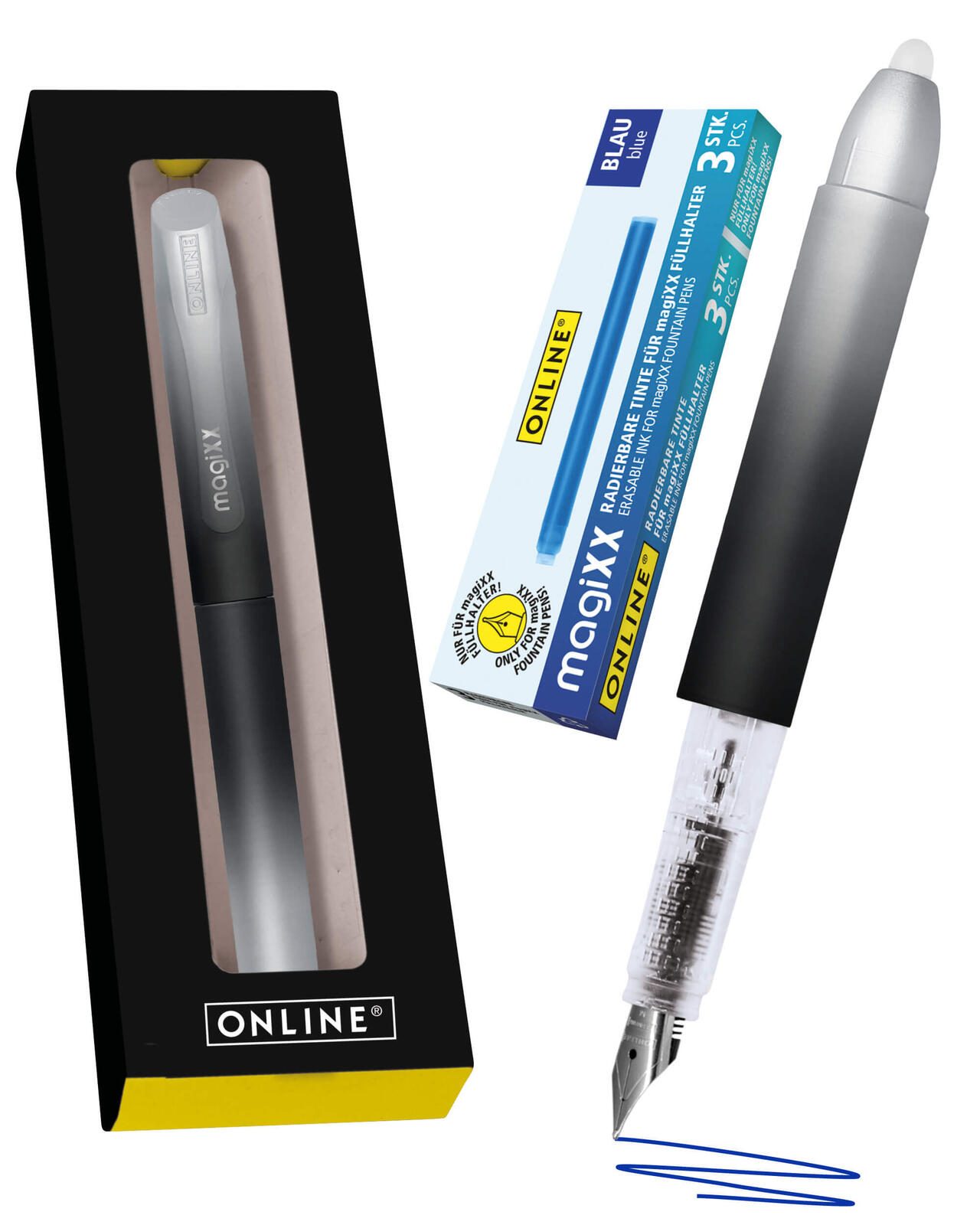 - Besonderheiten: radierbarer Füllhalter ohne Tintenkiller, 700 m Schreiblänge pro Patrone, druckresistente Federspitze, radierbare Tinte auf Wasserbasis