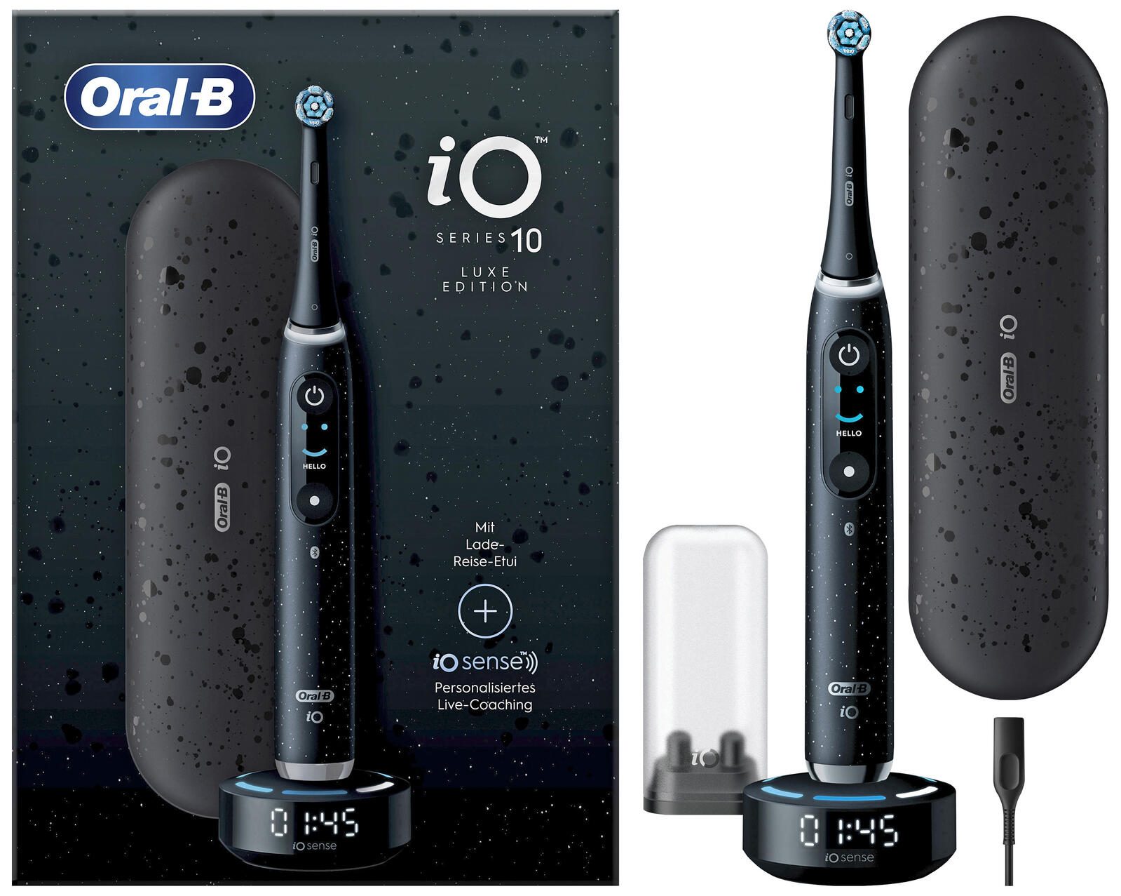 Im Lieferumfang sind neben dem Handstück auch eine Ladestation vom Typ iOSense, ein praktisches Reiseetui und eine Aufsteckbürste enthalten. Die Kombination aus innovativer Technik und durchdachtem Zubehör macht die Oral-B iO Series 10 Luxe Edition zu einem hochwertigen Mundpflegegerät für den täglichen Gebrauch.