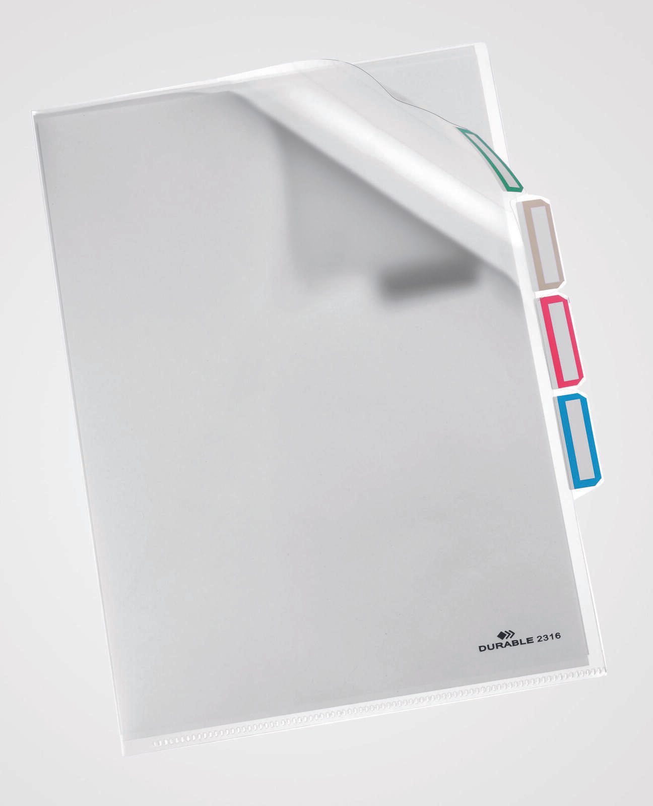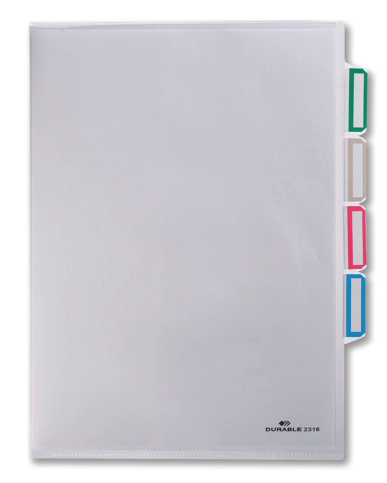 Die DURABLE Organisationshüllen in DIN A4 sind die perfekte Lösung für die übersichtliche und sichere Aufbewahrung deiner Dokumente. Mit einer Dicke von 0,16 mm bieten diese transparenten Hüllen nicht nur Stabilität, sondern auch eine ansprechende Optik, die es dir ermöglicht, den Inhalt auf einen Blick zu erkennen. Hergestellt aus hochwertigem Polypropylen (PP) sind sie dokumentenecht und schützen deine Unterlagen vor Verschmutzungen und Beschädigungen. Die Organisationshüllen sind mit einer praktischen 3-fach Teilung ausgestattet, die dir hilft, deine Dokumente effizient zu kategorisieren. Zusätzlich sind farbige Selbstklebeetiketten enthalten, die eine individuelle Beschriftung der Tabs ermöglichen. So behältst du stets den Überblick über deine Unterlagen und kannst sie schnell und einfach finden. Die Öffnungen der Hüllen befinden sich sowohl oben als auch seitlich, was das Einlegen und Entnehmen der Dokumente besonders bequem gestaltet. Ein weiteres praktisches Merkmal ist, dass die DURABLE Organisationshüllen keine Lochung aufweisen. Dies schützt deine Dokumente vor unschönen Löchern und gewährleistet, dass sie in einwandfreiem Zustand bleiben. Die genarbte Oberfläche sorgt zudem für eine angenehme Haptik und erhöht die Langlebigkeit der Hüllen. Mit einem Pack von 5 Stück bist du bestens ausgestattet, um deine Unterlagen ordentlich zu organisieren. Egal, ob für das Büro, die Schule oder den privaten Bereich – die DURABLE Organisationshüllen sind vielseitig einsetzbar und bieten dir die perfekte Lösung für deine Dokumentenablage. Setze auf Qualität und Funktionalität mit den DURABLE Organisationshüllen.Technische Daten