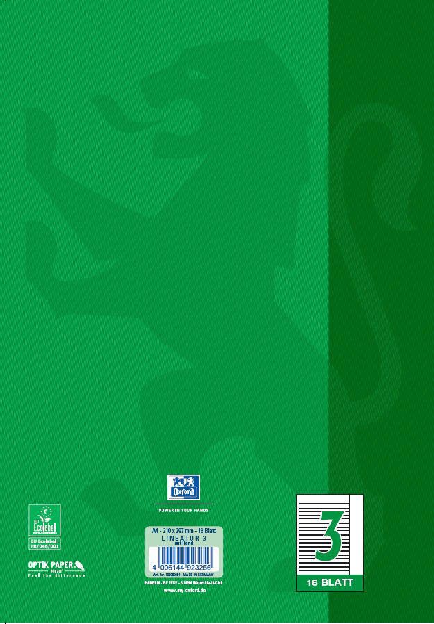 Du suchst nach einem hochwertigen Schulheft, das nicht nur umweltschonend hergestellt ist, sondern auch besondere Eigenschaften bietet? Dann ist das OXFORD Schulheft A4 Lin.3 mit RD liniert genau das Richtige für dich! Dieses Heft wurde umweltschonend hergestellt, was bedeutet, dass es nicht nur funktional, sondern auch nachhaltig ist. Mit seiner Optik Paper Technologie bietet es einen hohen Schreibkomfort, eine hohe Reißfestigkeit und ist beidseitig beschreibbar. Selbst bei intensiver Nutzung schlägt die Tinte nicht durch das Papier. Das OXFORD Schulheft ist zudem hochweiß und satiniert, was für ein angenehmes Schreibgefühl sorgt. Die Lineatur des Hefts ist klar strukturiert, was das Schreiben und Notieren erleichtert. Durch das Format DIN A4 und die 16 Blätter bietet das Heft ausreichend Platz für deine Notizen und Aufzeichnungen. Das OXFORD Schulheft A4 Lin.3 mit RD liniert ist die ideale Wahl für umweltbewusste Schüler und Studenten, die Wert auf Qualität und Nachhaltigkeit legen. Hol dir jetzt dieses hochwertige Heft und überzeuge dich selbst von seinen einzigartigen Vorteilen!Technische Daten