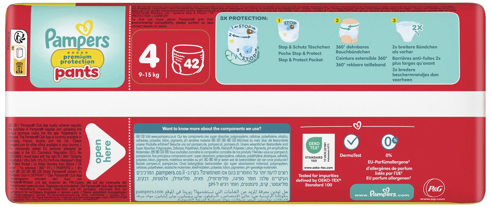 Diese Pampers® Windeln der Serie premium protection™ sind speziell für Babys und Kleinkinder mit einem Gewicht von 9 bis 15 Kilogramm konzipiert. Die Windeln sind in der Konfektionsgröße Gr.4 erhältlich und werden im praktischen BIG PACK mit 42 Stück geliefert. Sie sind als Pants, also als Windelhose, gestaltet, was das An- und Ausziehen erleichtert und eine bequeme Passform bietet.