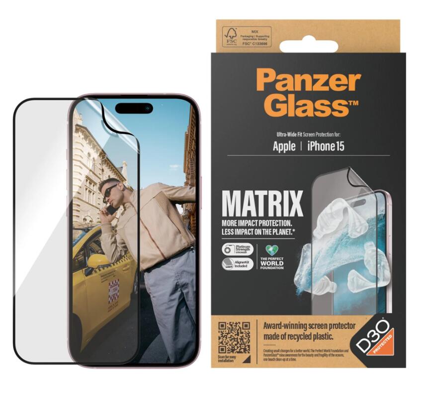 Wir brauchen Veränderung. Und die preisgekrönte MATRIX Displayschutzfolie von PanzerGlass™ IST Veränderung. Sie besteht aus 100% recyceltem Kunststoff. Sie wurde entwickelt, um die Lebensdauer deines Telefons zu verlängern. Sie wird in einer FSC™-zertifizierten Verpackung geliefert. Sie benötigt ca. 30 %* weniger Papierverpackung als frühere MATRIX-Modelle. Es verfügt über den D3O®-Aufprallschutz, der auch militärische Elitetruppen schützt. UND er schützt deinen Bildschirm vor versehentlichen Stößen, Stürzen und anderen Gefahren des Alltags. Mit anderen Worten: Bei MATRIX gibt es keine Abkürzungen oder "gut genug". Es ist einfach härter als hart.