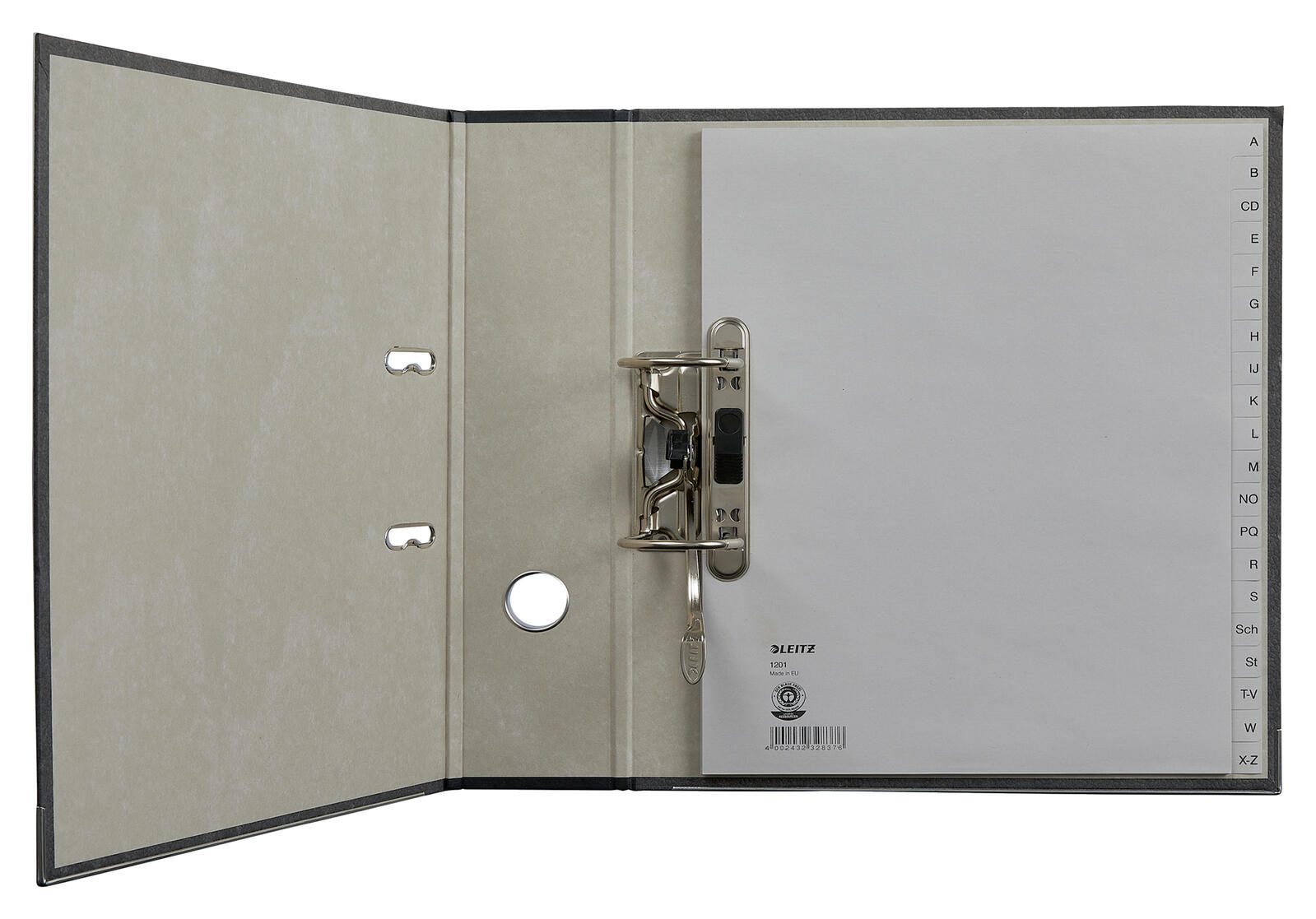 Das LEITZ Ordnerregister Vollformat, Überbreite A-Z DIN A4 ist die ideale Lösung für eine übersichtliche und strukturierte Ablage deiner Dokumente. Mit einem eleganten grauen Design fügt sich dieses Register perfekt in jedes Büro oder Home-Office ein. Es bietet eine praktische 20-teilige Teilung, die dir hilft, deine Unterlagen schnell und einfach zu kategorisieren. Die speziellen Taben sind bedruckt und ermöglichen eine klare Kennzeichnung von A bis Z, sodass du jederzeit den Überblick behältst. Das Vollformat und die Überbreite machen dieses Register besonders benutzerfreundlich, da es ausreichend Platz für alle deine Dokumente bietet. Hergestellt aus hochwertigem Tauenpapier, zeichnet sich das Register durch seine Langlebigkeit und Robustheit aus, was es zu einem zuverlässigen Begleiter in deinem Arbeitsalltag macht. Mit einer 2-fach-Lochung ist das LEITZ Ordnerregister einfach in jeden Standardordner einzufügen und sorgt dafür, dass deine Unterlagen sicher an ihrem Platz bleiben. Ein Pack enthält 10 Sätze, was dir die Möglichkeit gibt, mehrere Ordner gleichzeitig zu organisieren oder für zukünftige Projekte gut vorbereitet zu sein. Dieses Buchstaben-Register für DIN A4 Formate ist nicht nur funktional, sondern auch eine stilvolle Ergänzung für dein Büro. Die Kombination aus Qualität und durchdachtem Design macht das LEITZ Ordnerregister zu einer ausgezeichneten Wahl für alle, die Wert auf Ordnung und Effizienz legen.Technische Daten