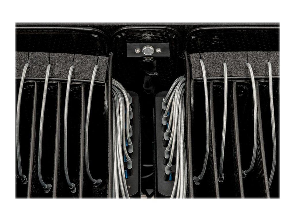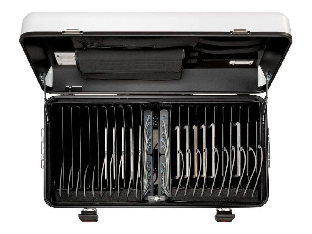Der PARAPROJECT® Case TC20 ist die sichere Transport- und Aufbewahrungslösung für bis zu 20 iPads® bis 12,9‘‘. Die integrierten und innovativen TwinCharge Module ermöglichen das unkomplizierte und schnelle Laden aller Geräte durch USB-A und USB-C Anschlüsse mittels USB-PD (Power Delivery) und QuickCharge. Die Einschubfächer sind aus ebenso leichten wie formstabilen „Con-Pearl®“-Kunststoffwaben gefertigt. Dank der in Deckel und Boden integrierten Öffnungen kann die Luft im Case optimal zirkulieren. Ein außen angebrachter Hauptschalter und ein Überspannungsschutz bieten die nötige Sicherheit im täglich Einsatz. Mit zwei Zahlenschlösser versehen und seiner UV-beständigen Außenschale aus 3 mm starkem, weißem ABS-PMMA-Kunststoff zeichnet sich der Systemkoffer darüber hinaus durch einen sicheren Rundumschutz aus. Die glatte Oberfläche eignet sich ideal, um den Case durch ein Label zu individualisieren. Vier Leichtlaufräder, davon zwei mit Radfeststellern, der 4-fach Trolley-Teleskopauszug und zwei seitlich angebrachte Tragegriffe sorgen für bequemes und sicheres Handling. Zudem überzeugt der PARAPROJECT® Case TC20 durch diverse Fächer und Taschen, die im Kofferdeckel eingearbeitet sind, mit seiner durchdachten Funktionalität. Im Case sind 20 USB-A-Kabel mit Lightning Connector und LED Anzeige mit MFi-Zertifizierung, Boost ChargeTM und Nylon-Verstärkung vorinstalliert.
