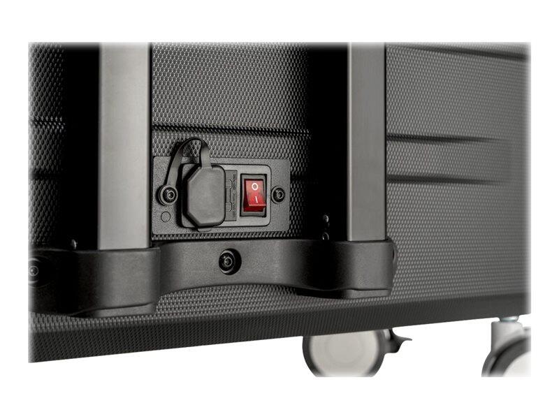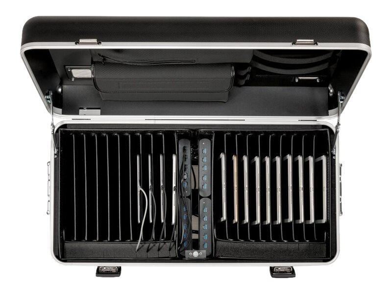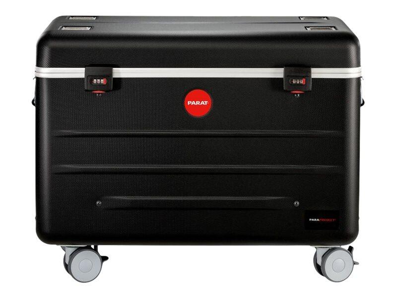 Der PARAPROJECT® Case TC20 GaN ist die sichere Transport- und Aufbewahrungslösung Nummer 1 für bis zu 20 Geräte bis 12,9“. Ganz gleich, ob Sie Modelle mit iOS-, Android- oder Windows-10-Betriebssystem im Einsatz haben. Die integrierten und innovativen TwinCharge GaN Module ermöglichen das unkomplizierte und schnelle Laden aller Geräte durch USB-A und USB-C® Anschlüsse mittels USB-PD (Power Delivery) und QuickCharge. Dank der innovativen GaN Verarbeitung überträgt der Charger den Strom effizienter und es geht weniger Energie durch Wärme verloren. Die Einschubfächer sind aus formstabilen „Con-Pearl®“-Kunststoffwaben gefertigt. Dank der in Deckel und Boden integrierten Öffnungen kann die Luft im Case optimal zirkulieren. Ein außen angebrachter Hauptschalter und ein Überstromschutz bieten die nötige Sicherheit im täglichen Einsatz. Mit zwei Zahlenschlösser versehen und seiner robusten Außenschale in schwarz aus X-ABS-Kunststoff zeichnet sich der Systemkoffer darüber hinaus durch einen sicheren Rundumschutz aus. Vier Leichtlaufräder, davon zwei mit Radfeststeller, der 4-fach Trolley-Teleskopauszug und zwei seitlich angebrachte Tragegriffe sorgen für bequemes und sicheres Handling. Zudem überzeugt der PARAPROJECT® Case TC20 GaN durch diversere Fächer und Taschen, die im Kofferdeckel eingearbeitet sind.