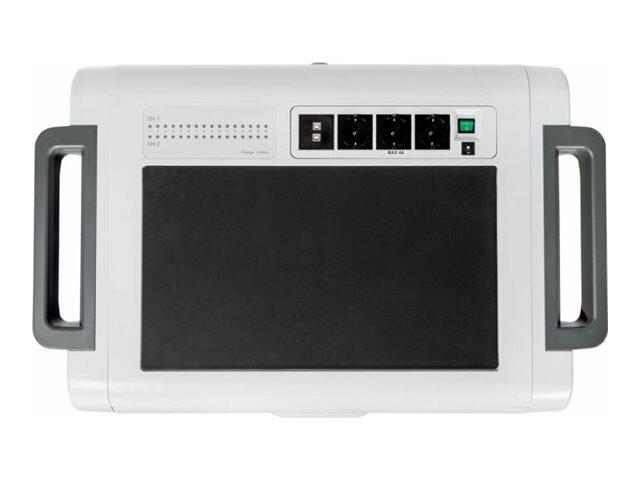 Statusanzeige, 2x USB-B Anschlüsse für Sync-Funktion und 3 schaltbare Steckdosen auf der Wagenoberseite