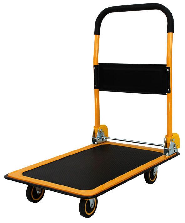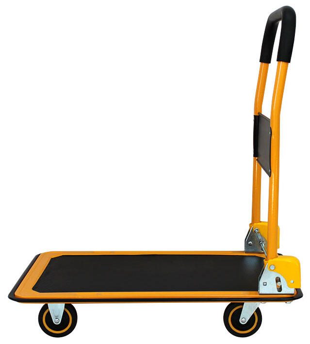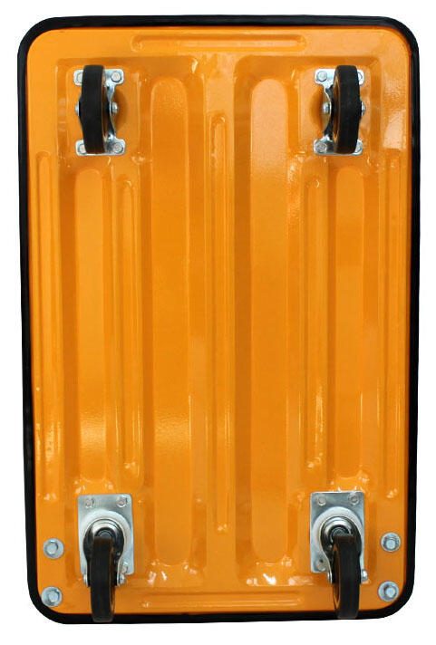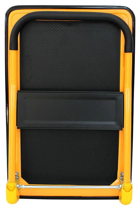 Die Plattform des Transportwagens ist ebenfalls aus Stahl gefertigt und in Schwarz gehalten, während die Räder aus Gummi bestehen und in den Farben Gelb und Schwarz gestaltet sind. Die Kombination dieser Materialien gewährleistet eine robuste und zugleich wendige Handhabung. Der Wagen verfügt über eine klappbare Funktion, die das Verstauen und den Transport erleichtert, wenn er nicht in Gebrauch ist.