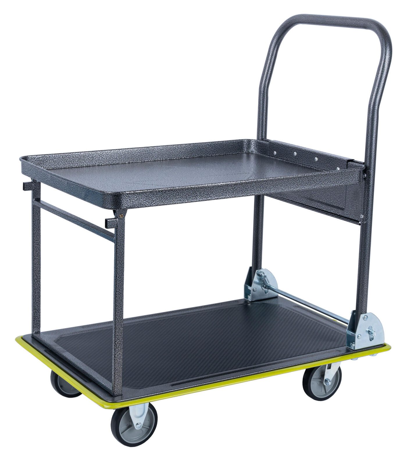 Die Plattform des Transportwagens besteht aus robustem Stahl und ist in einem anthrazitfarbenen Farbton gehalten, der sowohl unempfindlich als auch optisch ansprechend ist. Das Gestell ist ebenfalls aus Stahl gefertigt, was für Stabilität und Langlebigkeit sorgt. Die zwei Ebenen ermöglichen eine übersichtliche und geordnete Ablage von Materialien oder Werkzeugen.