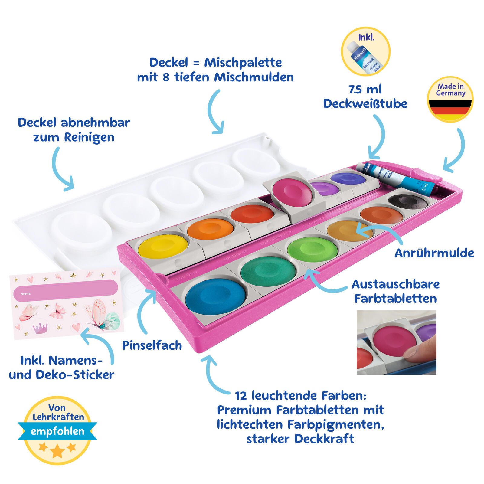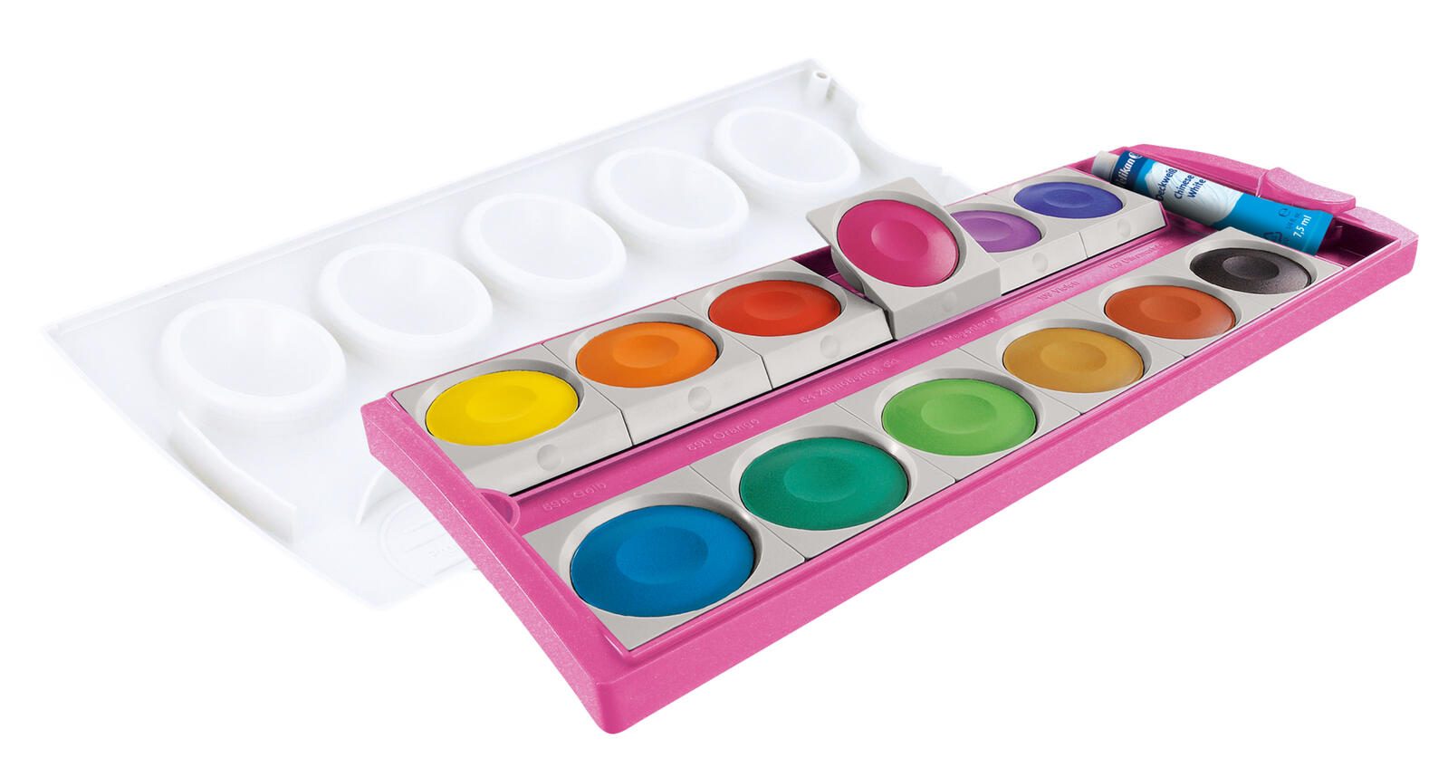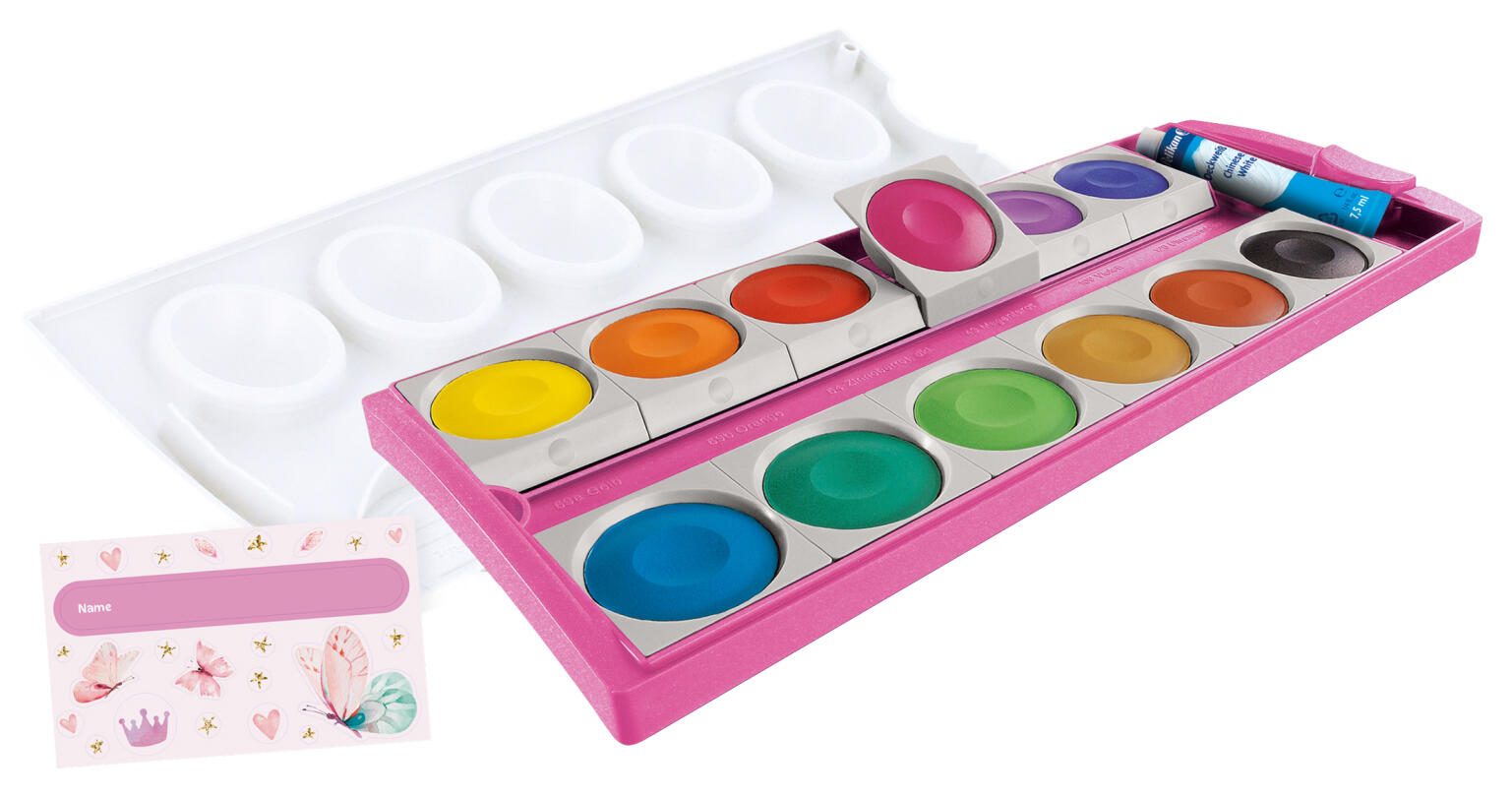- Besonderheiten: Auswechselbare Farbschälchen, viele Mischfelder, Starke Deckkraft dank hoher Pigmentdichte, Abnehmbarer Deckel mit Mischtöpfchen, Platz für Pinsel im Deckel