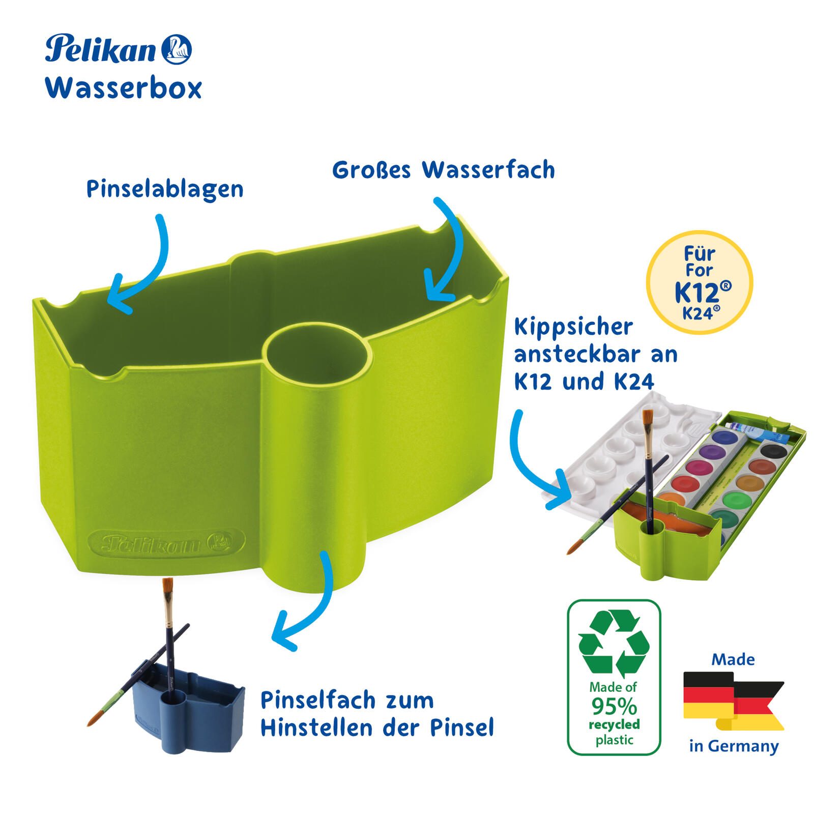 Der Pelikan Wasserbecher 735 in der Farbe Grün ist ein praktisches Zubehör für den Einsatz mit Deckfarbkästen. Er wurde speziell so gestaltet, dass er sich einfach an die Deckfarbkästen K12 und K24 anstecken lässt, wodurch er sich optimal in den Arbeitsablauf beim Malen und Zeichnen einfügt.