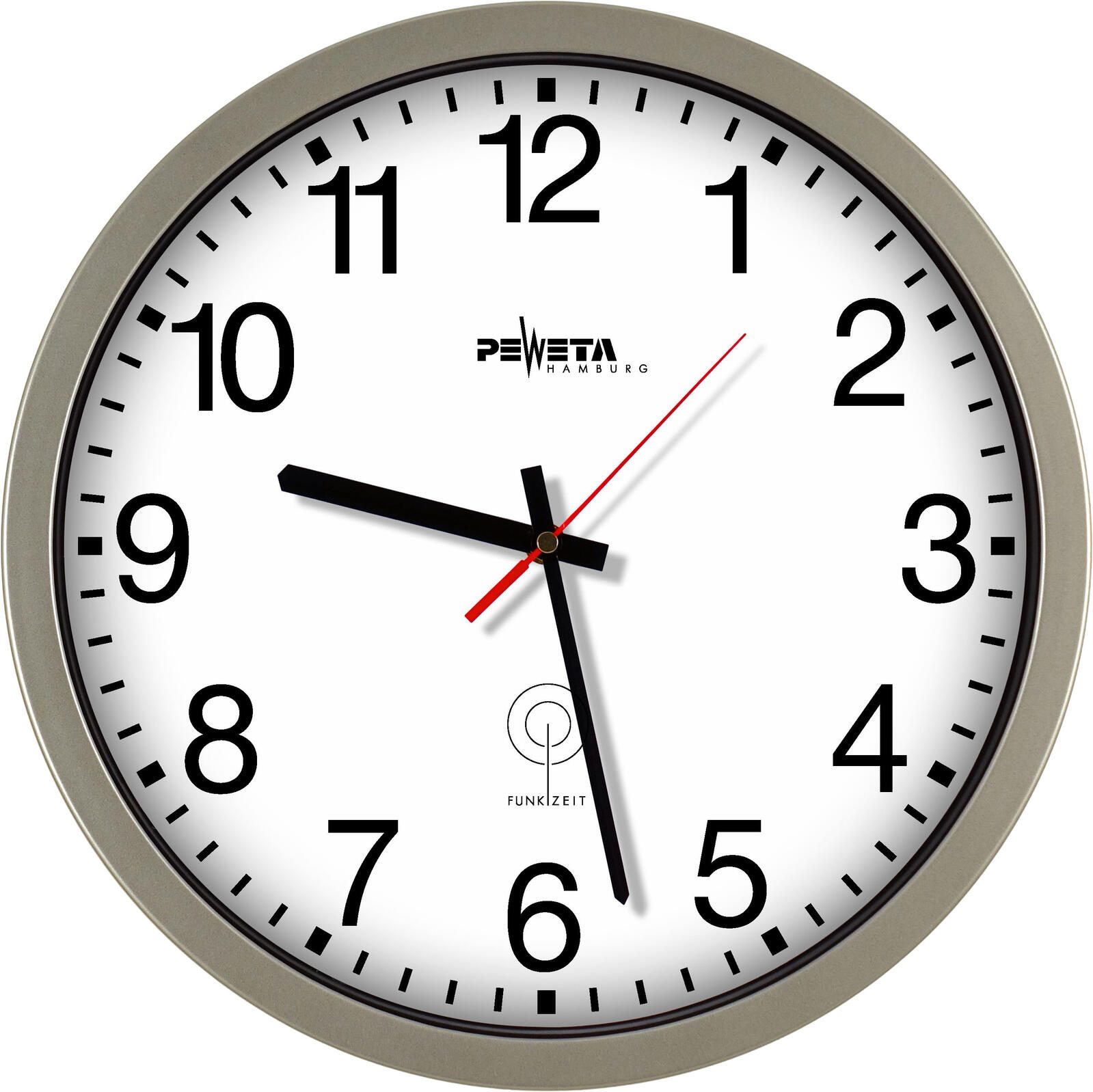 Die Peweta Funkuhr in Silber mit einem Durchmesser von 35 cm besticht nicht nur durch ihr elegantes Design, sondern auch durch ihre praktischen Funktionen. Diese runde Wanduhr von PEWETA überzeugt mit automatischer Zeitumstellung, einem Sekundenzeiger und einem lautlosen Uhrwerk.