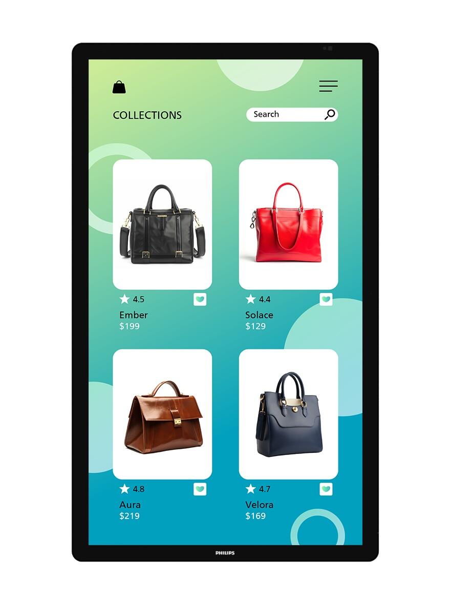 Montage im Hoch- oder Querformat möglich, bis zu 30° neigbar, mit Größenvarianten für verschiedene Montagezwecke. Ob auf dem Regal (ideal für Modelle mit 60 cm (24")), abgewinkelt oder aufrecht für Point-of-Sale, Konfiguratoren, Bestellannahmestellen und Kiosks (ideal für Modelle mit 80 cm (32") oder 108 cm (43")). Die größte Variante des Displays sind 139 cm (55").