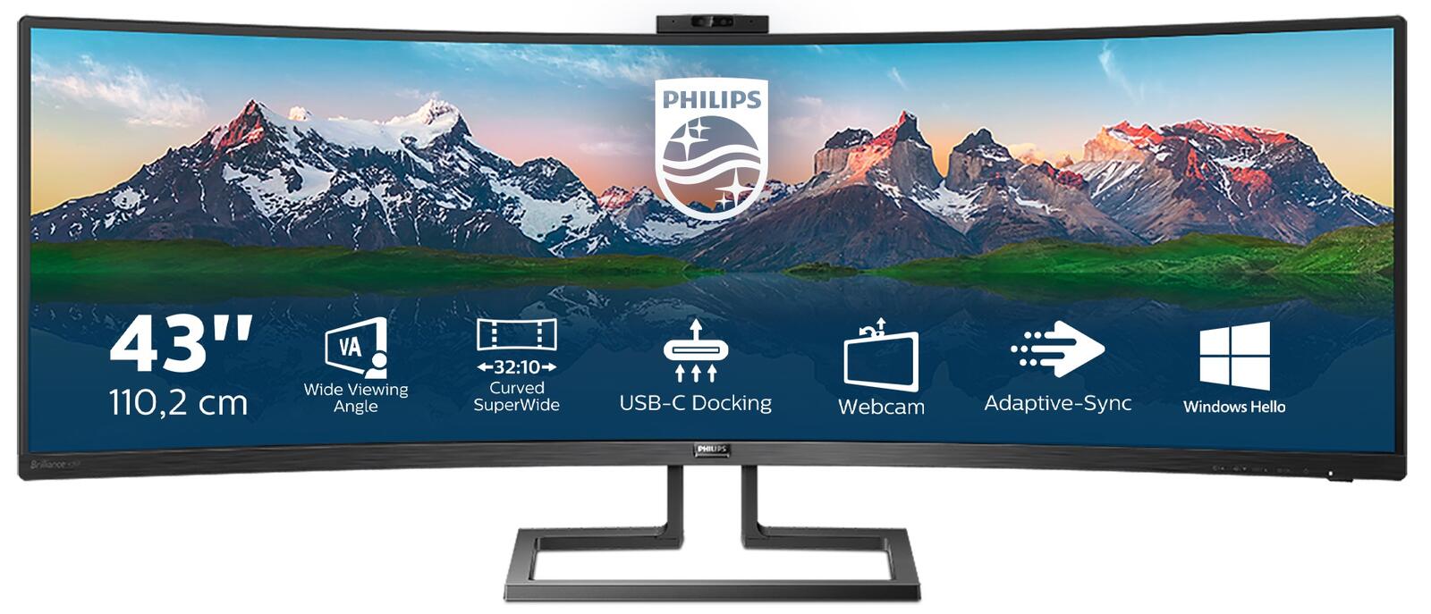 Der 110 cm (43") große Philips Curved SuperWide-Monitor in 32:10 ist vergleichbar mit zwei großen leistungsstarken Monitoren. Produktivitätssteigernde Funktionen wie USB-C und Pop-up-Webcam mit Windows Hello bieten bewährte Leistung und den