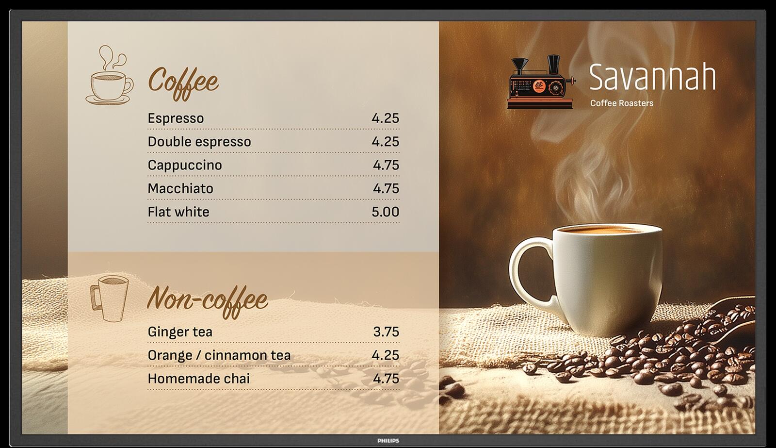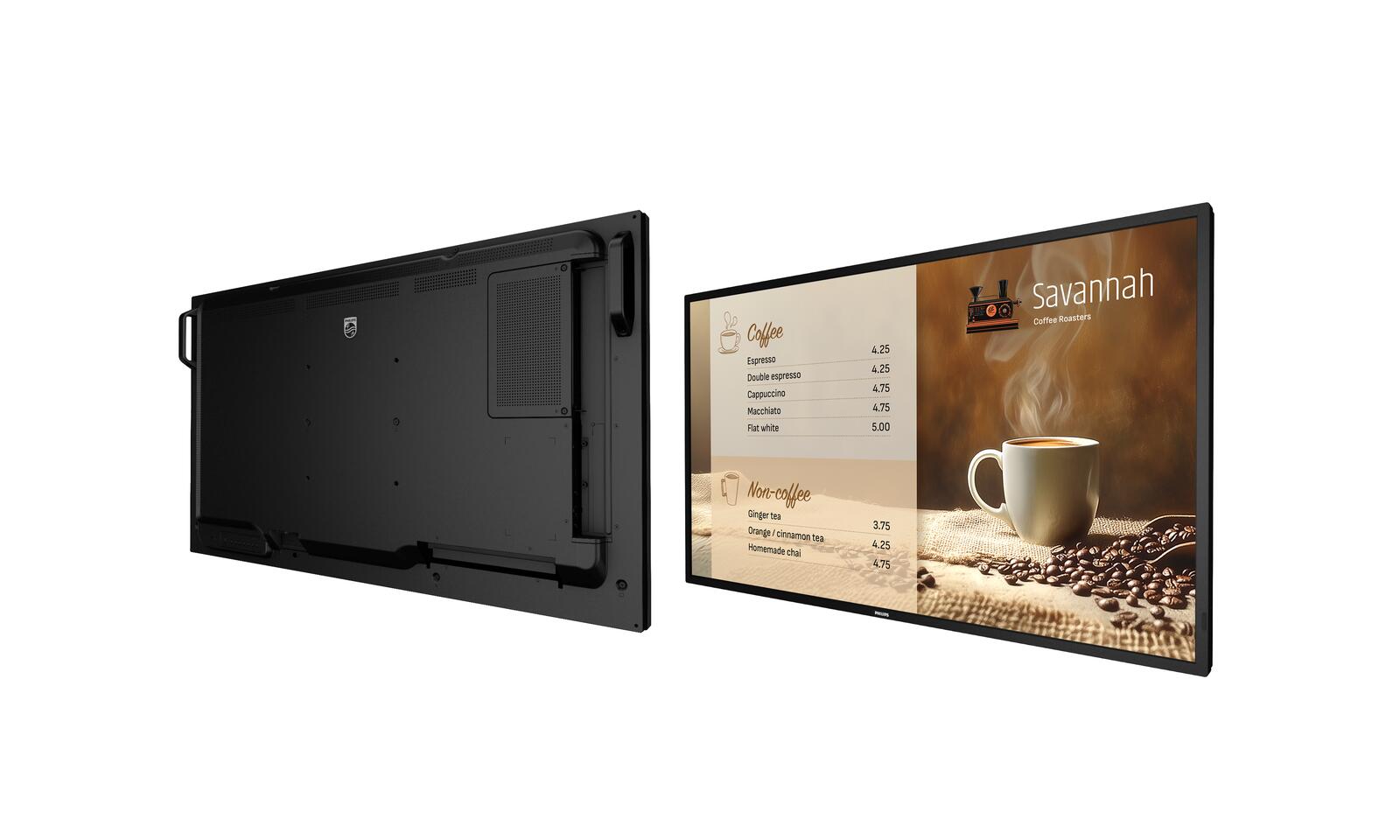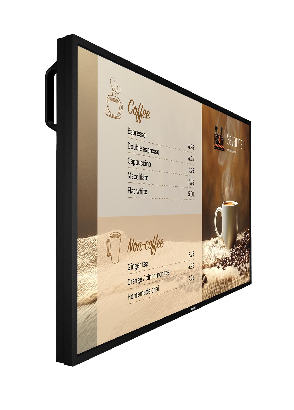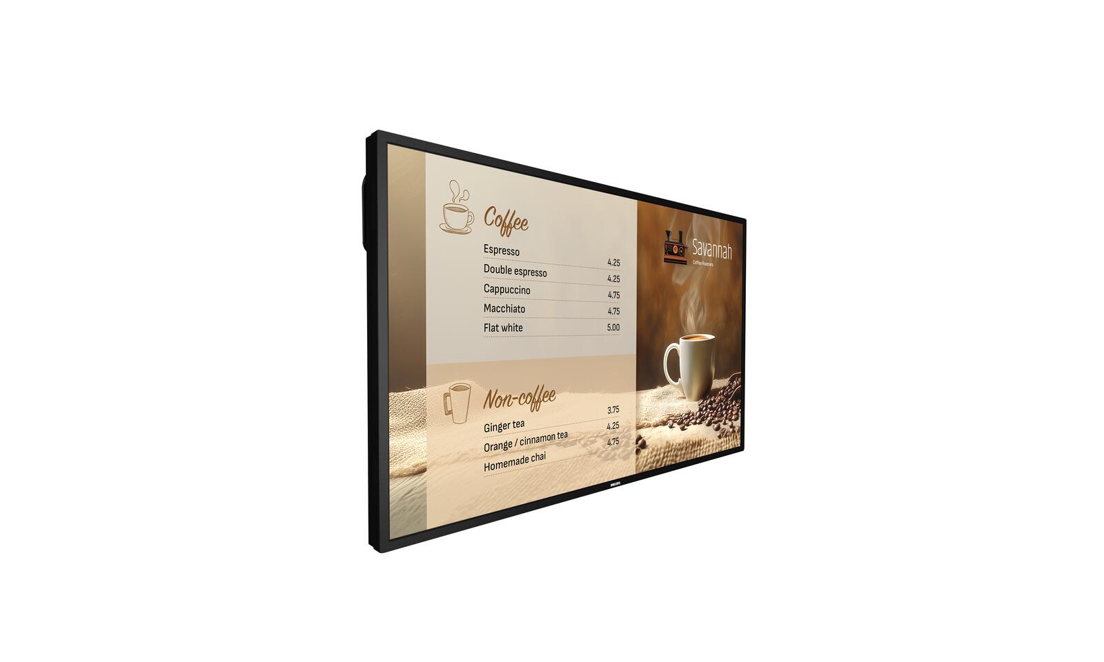 Mit einer Helligkeit von 800 cd/m² für bessere Sichtbarkeit bei hellem Umgebungslicht wurde die Philips Signage 6000 Series für die Verwendung rund um die Uhr entwickelt. Das macht sie zu einer großartigen Wahl für Reise- und Transportzentren, Gastronomiebetriebe und mehr.