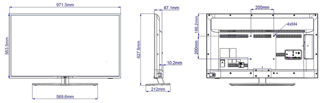 Bildschirm ohne Fuß - 97. 1 cm x 6. 7 cm x 56. 4 cm x 9. 2 kg ¦ Bildschirm mit Fuß - 97. 1 cm x 21. 2 cm x 62. 76 cm x 11. 2 kg