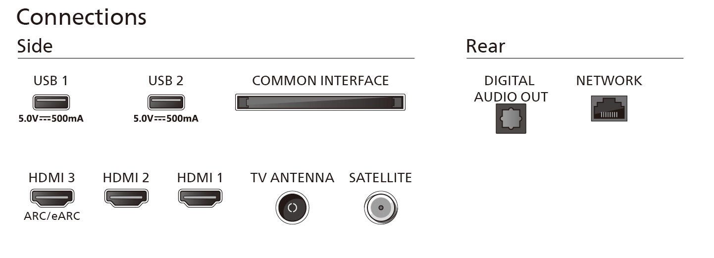 Als Betriebssystem kommt Google TV zum Einsatz, das eine einfache und übersichtliche Bedienung ermöglicht. Über WLAN, LAN und Bluetooth kann der Fernseher problemlos mit dem Internet und weiteren Geräten verbunden werden. Die Anschlussmöglichkeiten umfassen unter anderem drei HDMI-Anschlüsse, zwei USB-2.0-Ports sowie einen LAN-Anschluss und einen Kopfhöreranschluss, wodurch vielfältige Verbindungsoptionen für externe Geräte bestehen.