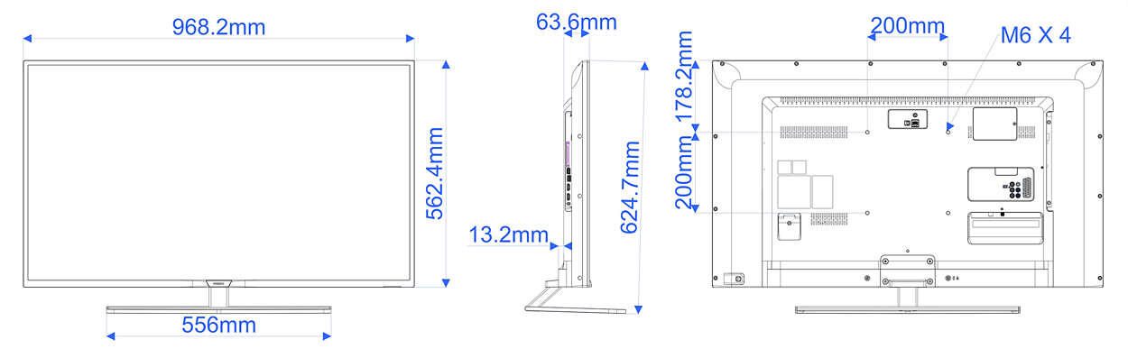 Bildschirm ohne Fuß - 96. 8 cm x 6. 4 cm x 56. 3 cm x 9. 1 kg ¦ Bildschirm mit Fuß - 96. 8 cm x 25 cm x 62. 5 cm x 10. 5 kg