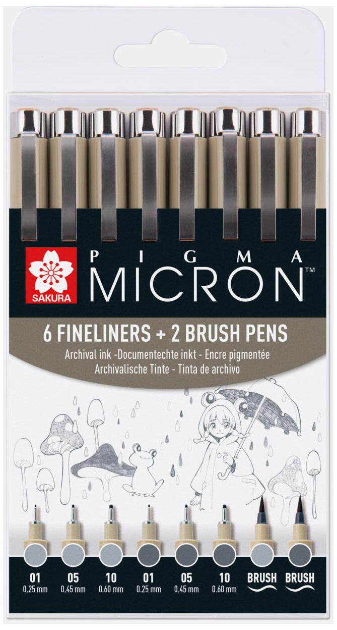 Der Sakura Pigma Micron Fineliner ist die ideale Wahl für kreative Köpfe, die Wert auf Präzision und Qualität legen. Dieses Set umfasst drei unterschiedliche Strichstärken von 0.25, 0.45 und 0.60 mm, sodass du für jede Zeichnung oder Schriftart den passenden Stift zur Hand hast. Die metallgefasste Spitze sorgt für eine lange Lebensdauer und gleichmäßige Linienführung, während die wischfeste und schnell trocknende Tinte auf Wasserbasis ein sauberes und professionelles Ergebnis garantiert. Mit insgesamt acht Stiften in zwei verschiedenen Grautönen – vier hellgrau und vier dunkelgrau – bietet dieses Set eine hervorragende Farbvielfalt, die sich perfekt für Skizzen, Illustrationen oder technische Zeichnungen eignet. Die dokumentenechte Tinte sorgt dafür, dass deine Kunstwerke auch langfristig erhalten bleiben, ohne zu verblassen. Darüber hinaus verfügen die Stifte über praktische Clips, die dir helfen, sie sicher zu transportieren und immer griffbereit zu haben. Der runde Griff der Fineliner ermöglicht ein komfortables und ermüdungsfreies Schreiben, was besonders bei längeren Arbeiten von Vorteil ist. Egal, ob du ein Hobbykünstler, ein Schüler oder ein professioneller Designer bist, dieses Fineliner-Set wird deine kreativen Projekte bereichern und dir helfen, deine Ideen präzise und ansprechend umzusetzen. Die Pigma Micron Serie von Sakura ist bekannt für ihre hohe Qualität und Zuverlässigkeit, was sie zur bevorzugten Wahl für viele Künstler und Designer macht.Technische Daten