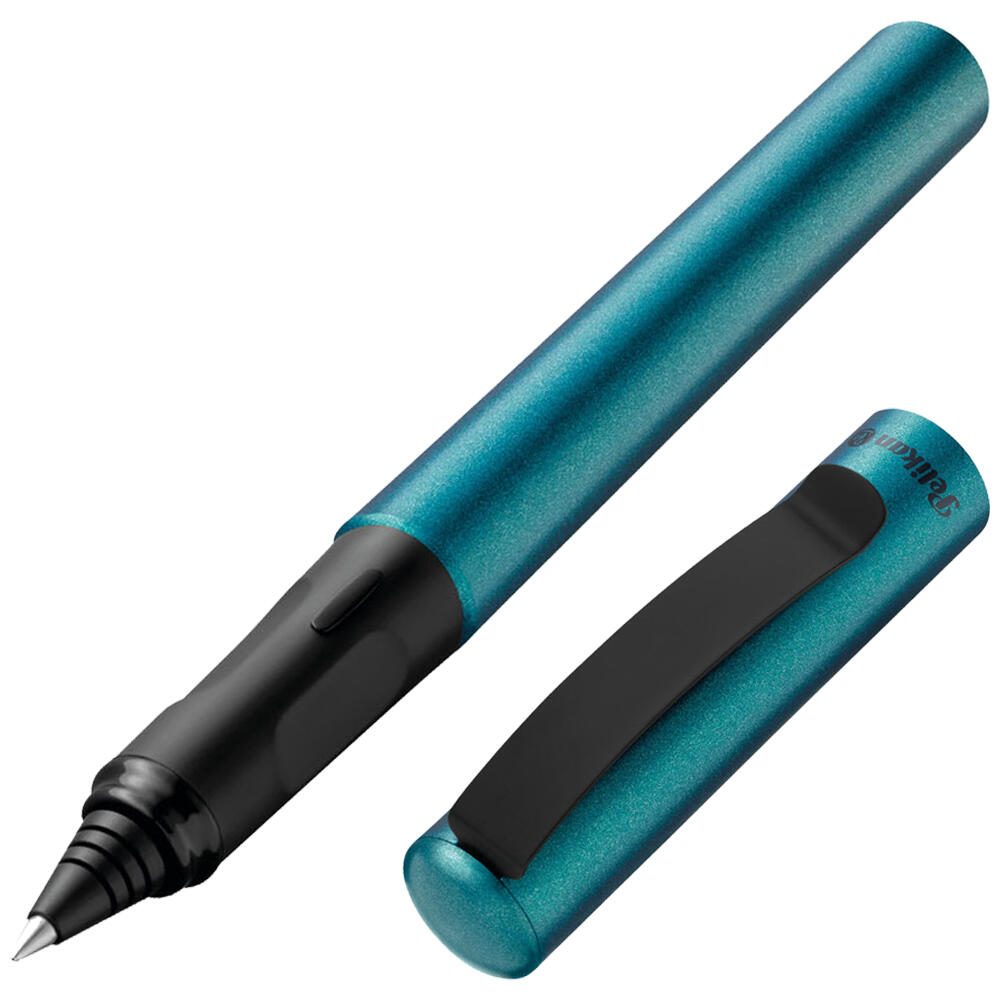 Der Pelikan Tintenroller in türkisem Farbton ist ein hochwertiges Schreibgerät sowohl für Rechts- als auch Linkshänder. Die Kugelspitze garantiert ein angenehmes Schreibgefühl und präzise Linien mit einer Strichstärke von 0.7 mm in leuchtendem Blau, ideal für den Alltag.