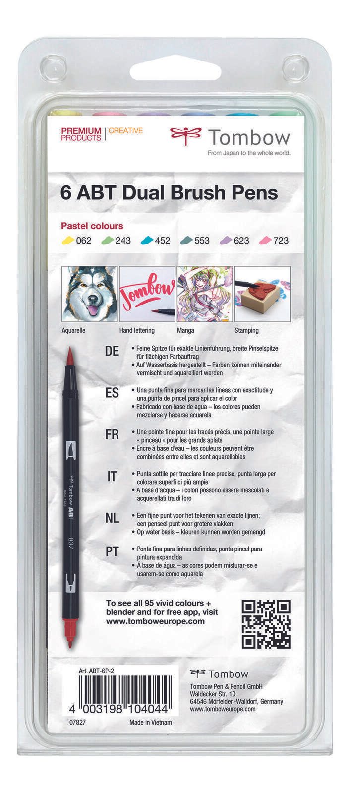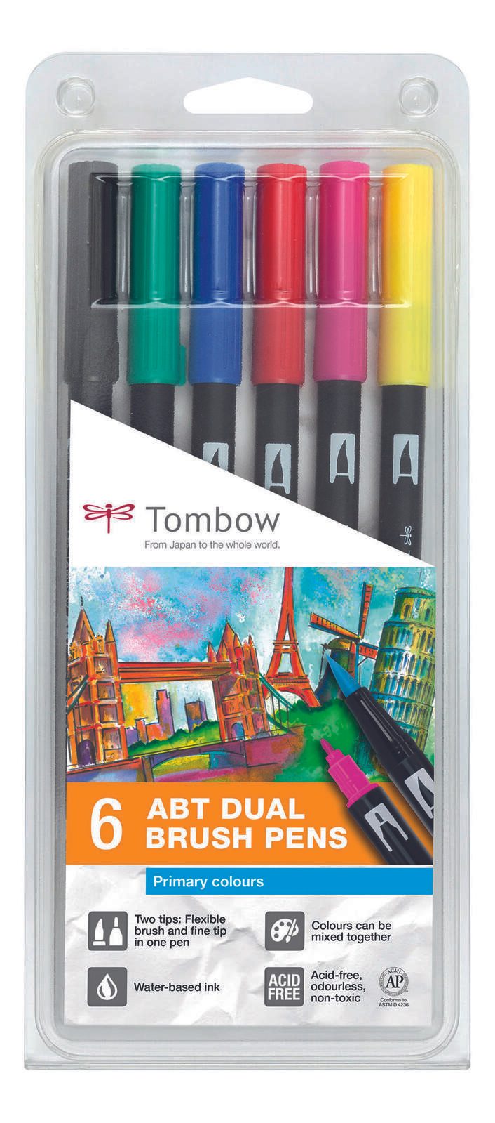 Die Tombow Brush-Pens sind die perfekte Wahl für kreative Köpfe, die Wert auf Qualität und Vielseitigkeit legen. Mit einer Strichstärke von 0.8 mm für präzise Linien und 3.3 mm für breite Pinselstriche bieten diese Stifte eine beeindruckende Flexibilität, um deine Ideen zum Leben zu erwecken. Die Kombination aus Fein- und Pinselspitze ermöglicht es dir, sowohl filigrane Details als auch kräftige, ausdrucksstarke Akzente zu setzen. Die Schreibfarbe der Tombow Brush-Pens umfasst ein lebendiges Spektrum von Primärfarben: schwarz, grün, blau, pink, rot und gelb. Diese Auswahl an Farben eröffnet dir unzählige Möglichkeiten, deine Projekte individuell zu gestalten. Egal, ob du in der Kunst, im Design oder in der Handlettering-Welt tätig bist, die Farben sind ideal, um deine Kreativität zu entfalten und beeindruckende Ergebnisse zu erzielen. Die Stifte sind in einem praktischen Kunststoff-Etui verpackt, das sowohl für die Aufbewahrung als auch für den Transport ideal ist. Mit einem runden Griff liegen die Brush-Pens angenehm in der Hand und ermöglichen ein müheloses Zeichnen und Schreiben über längere Zeiträume. Die Tombow Brush-Pens sind nicht nur für Profis, sondern auch für Hobbykünstler und kreative Anfänger geeignet. Sie bieten eine einfache Handhabung und eine hohe Farbintensität, die deine Kunstwerke zum Strahlen bringt. Mit einem Pack bestehend aus 6 Stiften hast du immer die richtigen Farben zur Hand, um deiner Kreativität freien Lauf zu lassen. Erlebe die Vielseitigkeit und die hochwertigen Eigenschaften der Tombow Brush-Pens und entdecke, wie sie deine kreativen Projekte bereichern können.Technische Daten