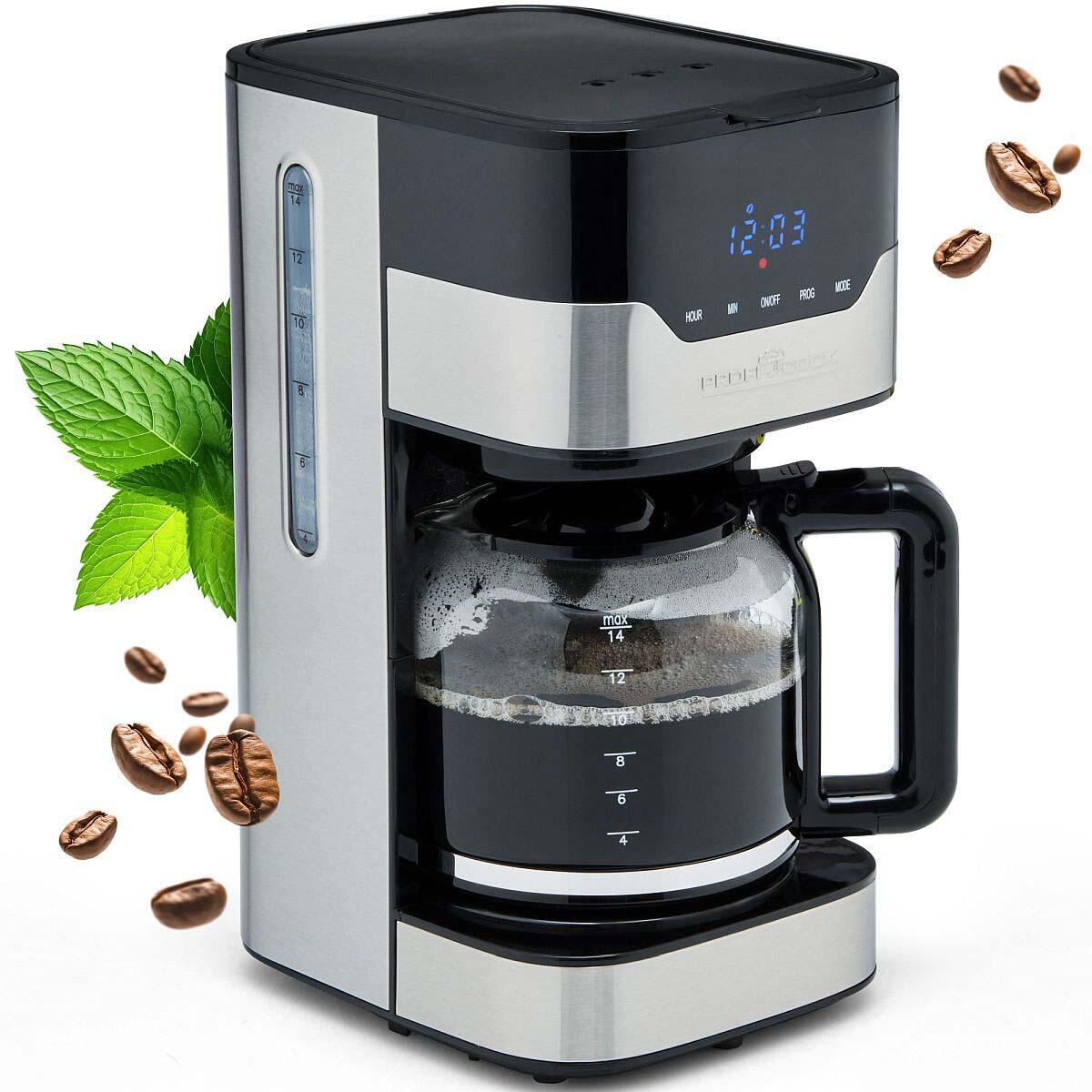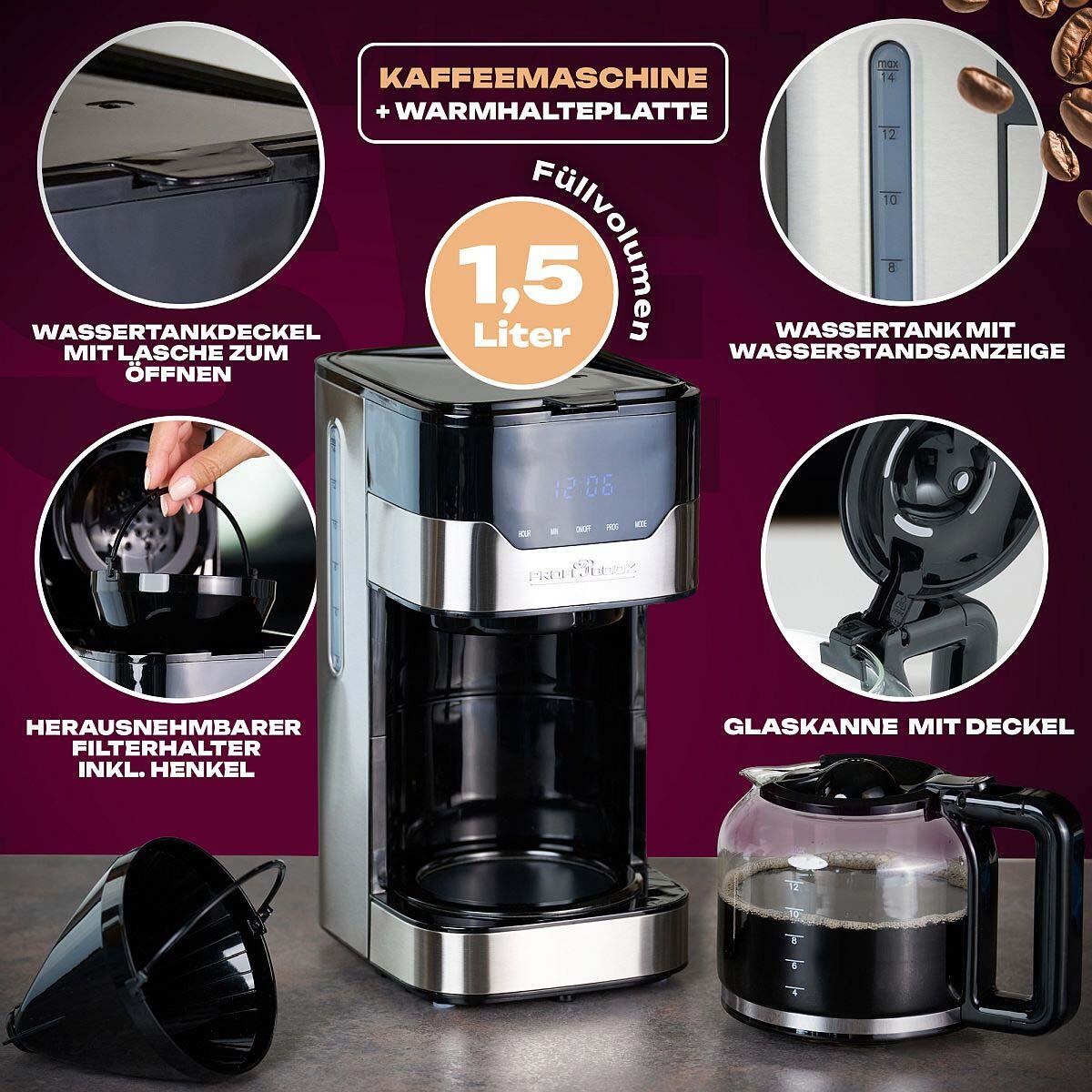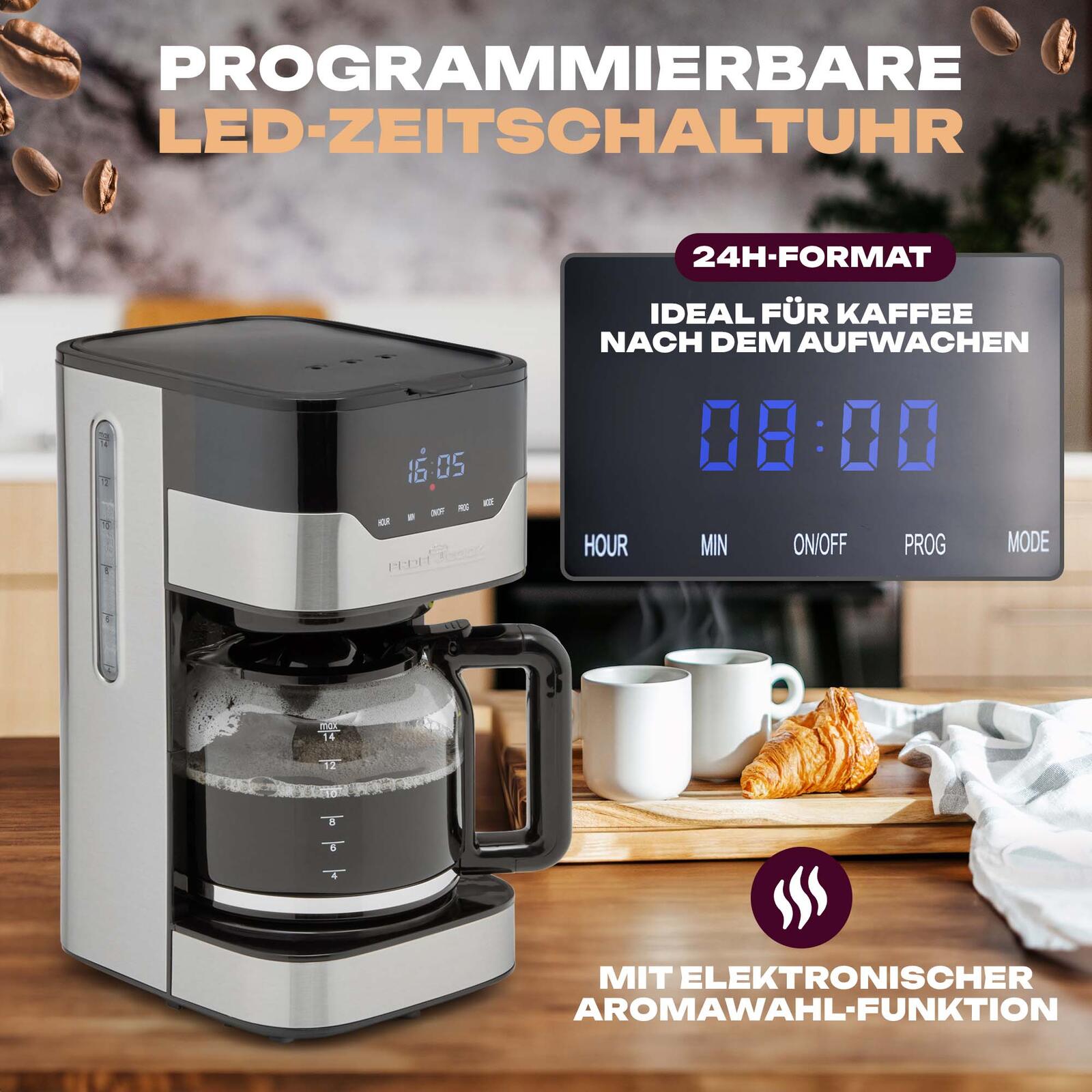Die ProfiCook PC-KA 1169 Kaffeemaschine in elegantem silber/schwarz überzeugt durch ihre vielseitigen Funktionen und ihr ansprechendes Design. Mit einer Leistungsaufnahme von 900 W ist sie nicht nur leistungsstark, sondern auch effizient. Diese Kaffeemaschine ist ideal für große Kaffeerunden und erfüllt die Bedürfnisse von Kaffeeliebhabern, die Wert auf Qualität und Komfort legen. Dank der praktischen Abschaltautomatik sorgt die Maschine dafür, dass du dir keine Sorgen um das Ausschalten machen musst, während der herausnehmbare Filtereinsatz die Reinigung zum Kinderspiel macht. Das Tropf-Stopp-System ermöglicht es dir, die Kaffeekanne jederzeit zu entnehmen, ohne dass es zu unschönen Tropfen kommt. Die Warmhaltefunktion hält deinen Kaffee lange auf der perfekten Temperatur, sodass du jederzeit in den Genuss eines frisch gebrühten Kaffees kommen kannst. Ein weiteres Highlight ist die Wasserstandsanzeige, die dir genau zeigt, wie viel Wasser sich im Tank befindet. Die 3-Stufen Aromawahlfunktion gibt dir die Möglichkeit, den Geschmack deines Kaffees individuell anzupassen, während die programmierbare 24-Stunden-Digitaluhr dir Flexibilität und Komfort bietet. Die rutschfesten Füße sorgen für einen stabilen Stand und verhindern ein Verrutschen der Maschine während des Gebrauchs. Die ProfiCook PC-KA 1169 vereint Funktionalität mit einem modernen Design und ist die perfekte Wahl für alle, die eine zuverlässige und benutzerfreundliche Kaffeemaschine suchen. Mit dieser Maschine wird jeder Kaffeegenuss zum Erlebnis.Technische Daten