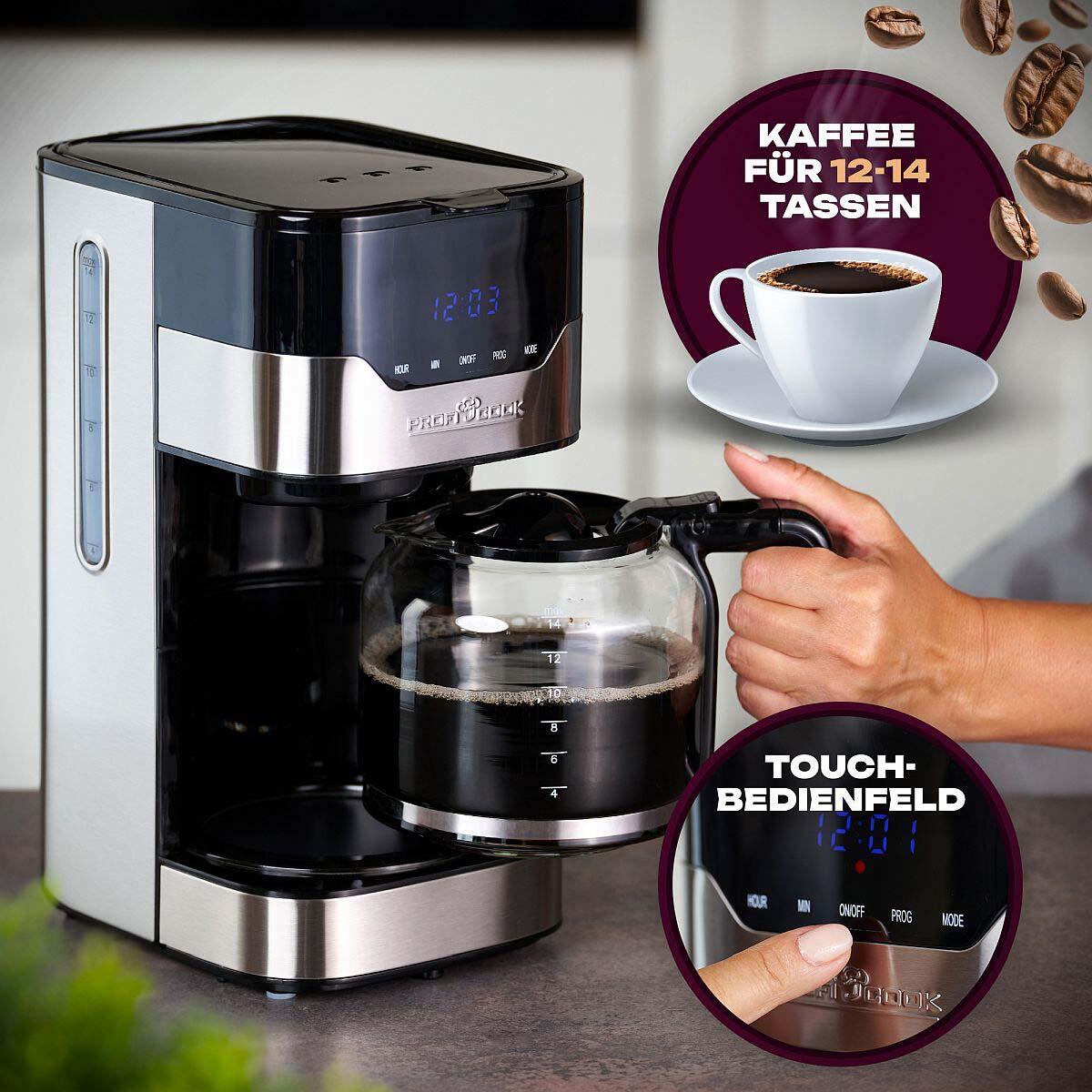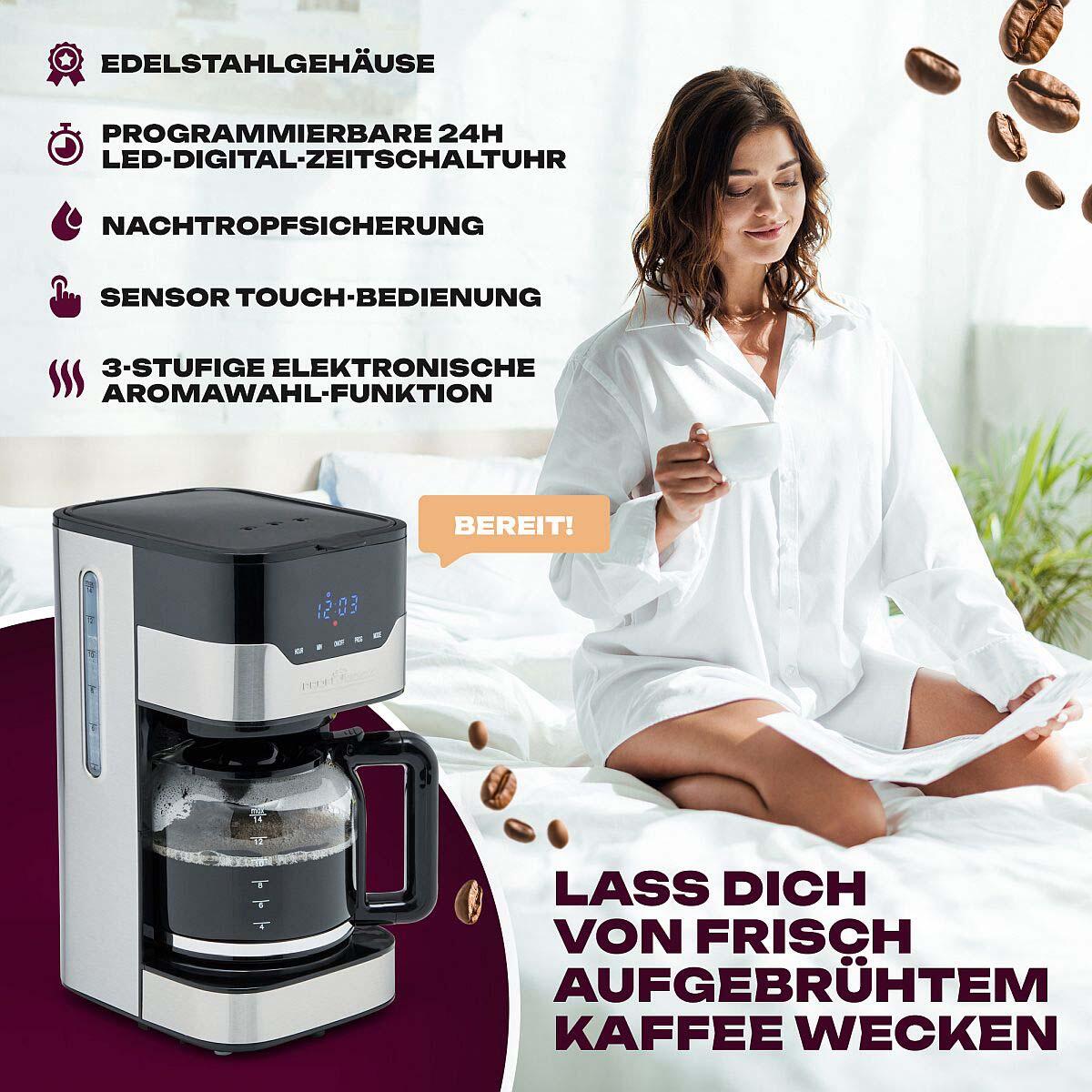 - Besonderheiten: ideal für große Kaffeerunden, 3-Stufen Aromawahlfunktion, programmierbare 24-Stunden-Digitaluhr, rutschfeste Füße