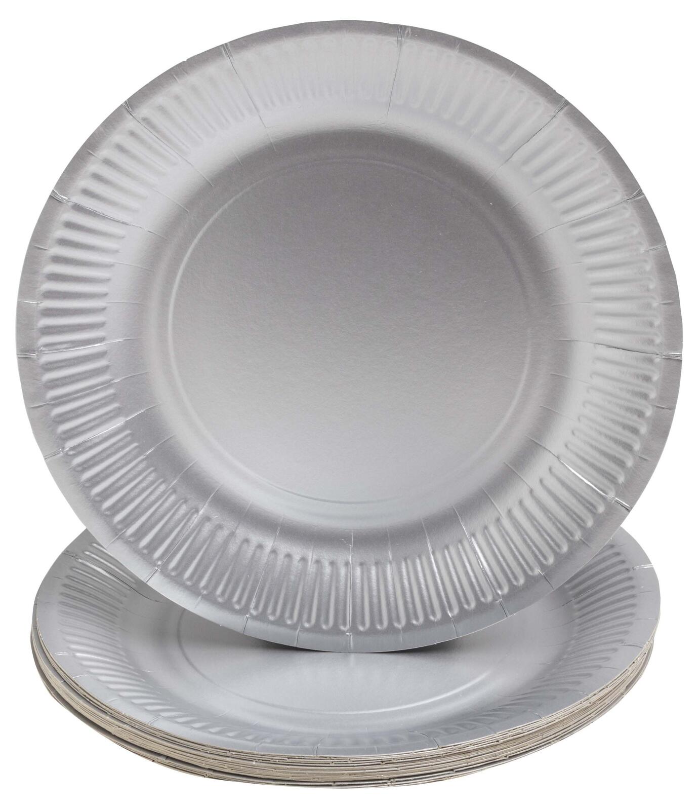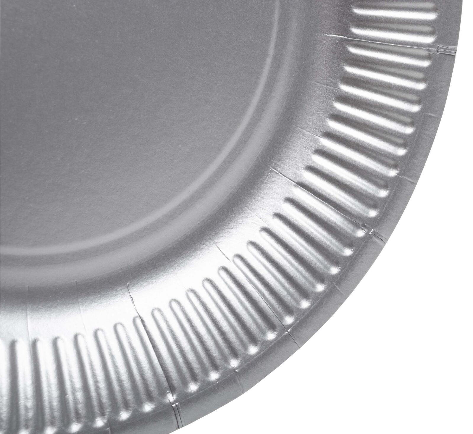 Die Packung enthält 10 Stück der silberfarbenen Pappteller, die sich durch ihre einfache Handhabung und stabile Beschaffenheit auszeichnen. Die Farbe Silber verleiht den Tellern ein schlichtes und zugleich elegantes Aussehen, das für verschiedene Anlässe geeignet ist.
