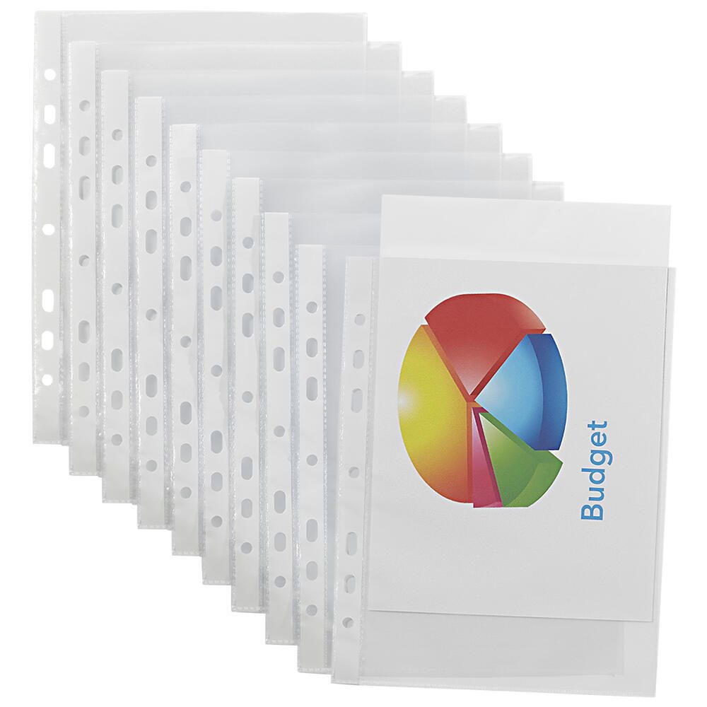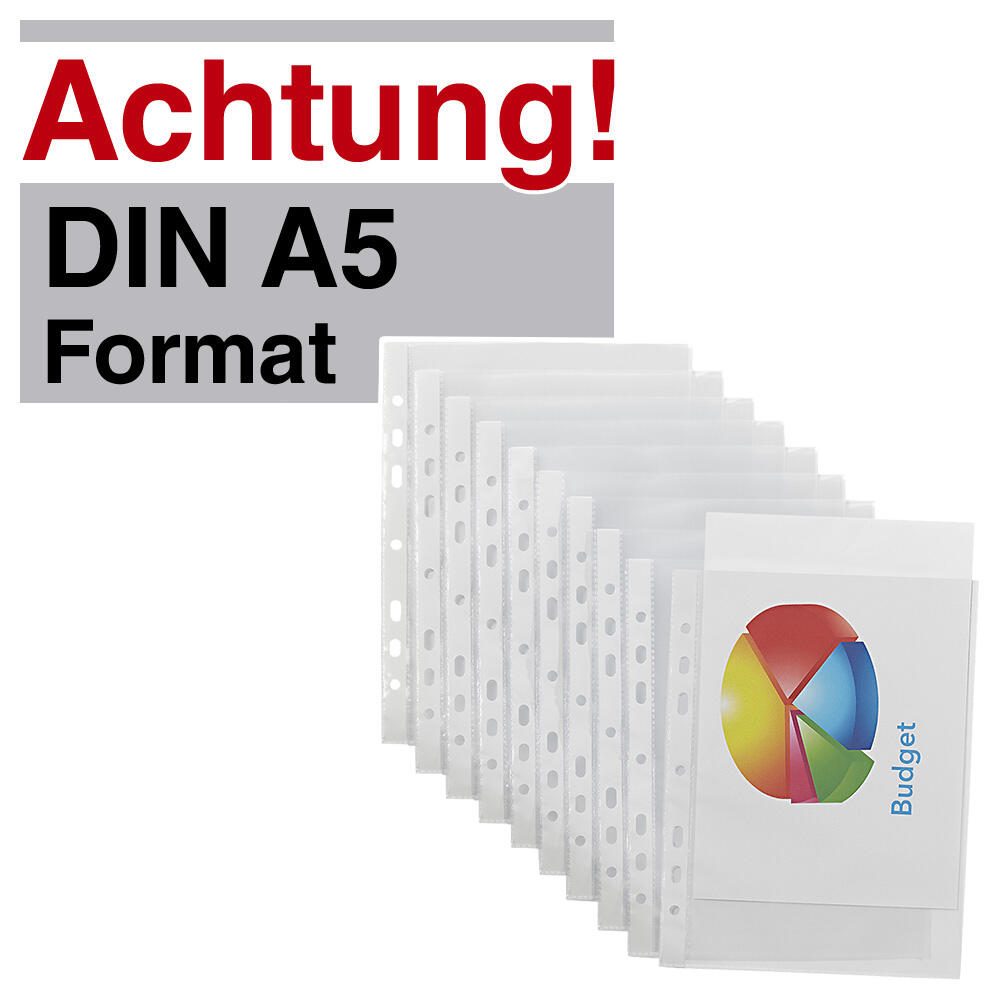 Die Lands Prospekthüllen A5 0.08 mm transparent bieten eine ideale Lösung für die übersichtliche und sichere Aufbewahrung deiner Dokumente. Mit einem transparenten Design ermöglichen sie eine klare Sicht auf den Inhalt, sodass du jederzeit sofort erkennst, was sich in der Hülle befindet. Diese Prospekthüllen sind nicht nur funktional, sondern auch ästhetisch ansprechend, da sie sich nahtlos in jedes Büro- oder Schulumfeld einfügen. Hergestellt aus hochwertigem Polypropylen (PP), garantieren die Hüllen eine dokumentenechte Aufbewahrung. Das Material ist langlebig und schützt deine Unterlagen vor Staub, Schmutz und Feuchtigkeit. Dank der 7-fach-Lochung lassen sich die Hüllen problemlos in Ordnern abheften, sodass du deine Dokumente stets geordnet und griffbereit hast. Die Öffnung an der Oberseite ermöglicht ein einfaches Einlegen und Entnehmen der Blätter, ohne dass du die Hülle umdrehen musst. Mit einer Stärke von 0.08 mm bieten die Lands Prospekthüllen eine optimale Balance zwischen Flexibilität und Stabilität. Sie sind ideal für die Aufbewahrung von wichtigen Unterlagen, Präsentationen oder Schulmaterialien und eignen sich sowohl für den privaten als auch für den professionellen Gebrauch. Jede Packung enthält 100 Stück, was sie zu einer praktischen Wahl für alle macht, die regelmäßig Dokumente organisieren müssen. Die genarbte Oberfläche der Hüllen sorgt nicht nur für eine ansprechende Optik, sondern erhöht auch die Griffigkeit, sodass du die Hüllen sicher in der Hand halten kannst. Entscheide dich für die Lands Prospekthüllen A5 0.08 mm transparent und profitiere von einer durchdachten Aufbewahrungslösung, die sowohl funktional als auch stilvoll ist.Technische Daten