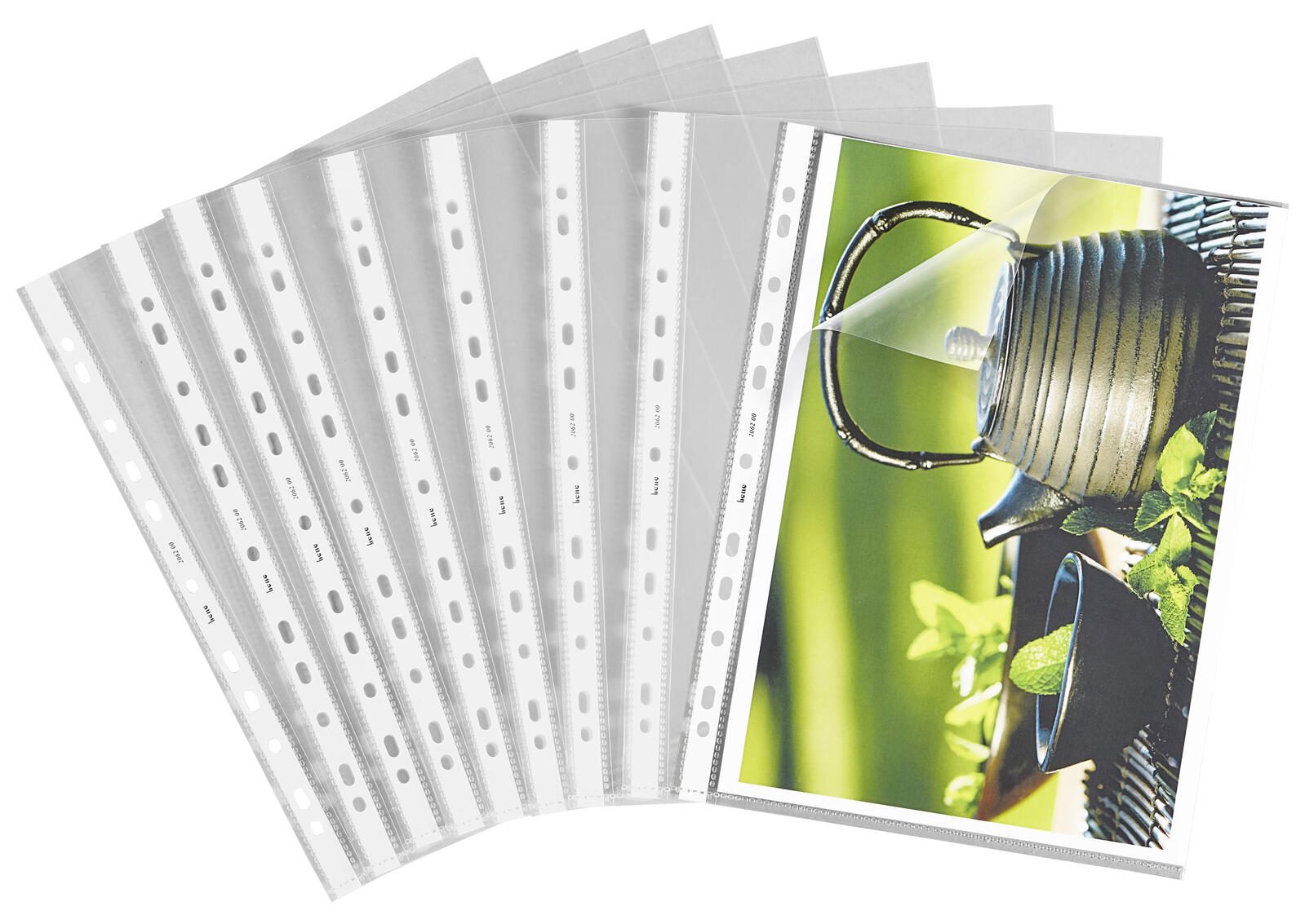 Die bene Prospekthüllen DIN A4 0.11 mm glasklar bieten eine elegante und praktische Lösung für die Aufbewahrung und Präsentation deiner Dokumente. Hergestellt aus hochwertigem Polypropylen (PP), garantieren diese Hüllen eine dokumentenechte Aufbewahrung, die deine Unterlagen vor Staub, Schmutz und Abnutzung schützt. Mit einer glatten Oberfläche und einer glasklaren Farbe ermöglichen sie eine klare Sicht auf den Inhalt, sodass du wichtige Informationen jederzeit schnell erfassen kannst. Die praktische Öffnung oben und der Lochrand sorgen für eine einfache Handhabung und ermöglichen ein schnelles Abheften in Ordnern oder Mappen. Die Universal-Lochung ist mit den meisten Ablagesystemen kompatibel, was dir maximale Flexibilität in der Organisation deiner Unterlagen bietet. Egal, ob für das Büro, die Schule oder zu Hause, diese Prospekthüllen sind ideal, um deine Dokumente ordentlich und sicher aufzubewahren. Jede Packung enthält 25 Stück, sodass du ausreichend Vorrat hast, um deine wichtigsten Unterlagen zu schützen. Die bene Prospekthüllen sind nicht nur funktional, sondern auch ästhetisch ansprechend, was sie zur perfekten Wahl für Präsentationen und wichtige Meetings macht. Vertraue auf die Qualität von bene und halte deine Dokumente in einem einwandfreien Zustand.Technische Daten