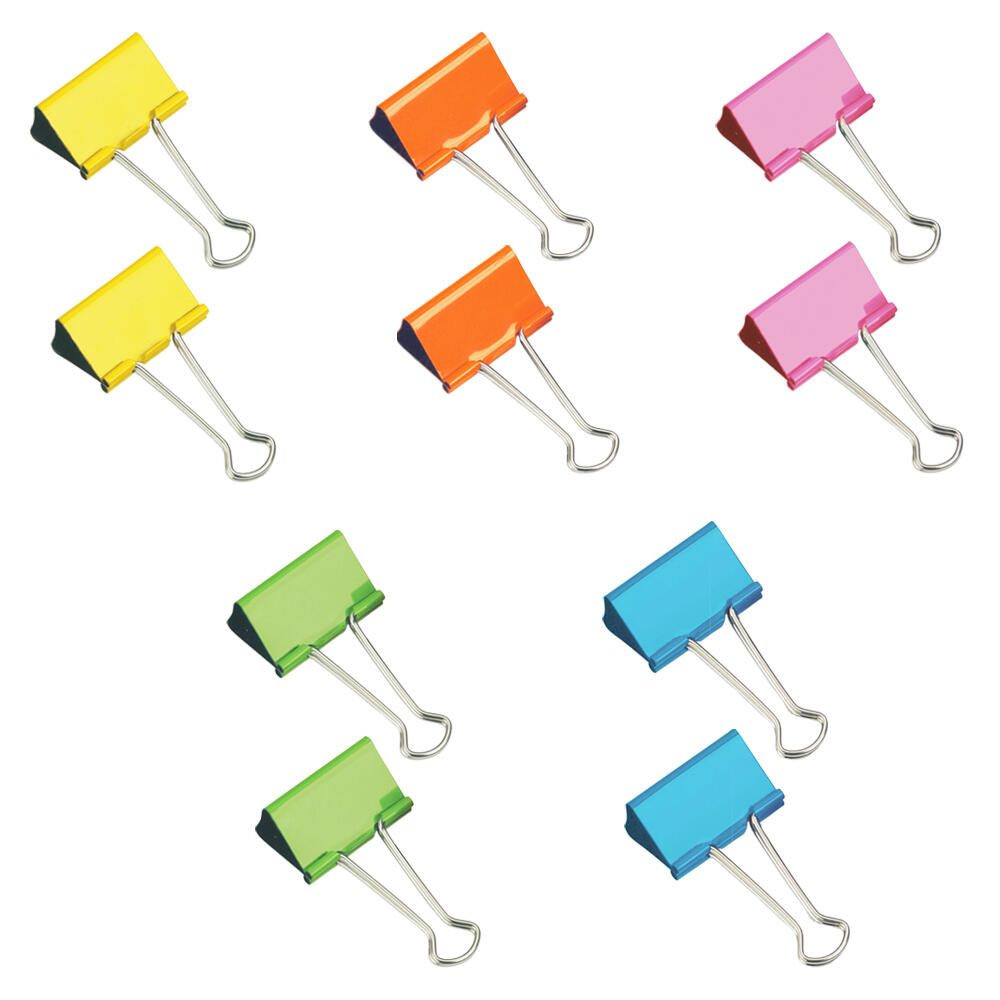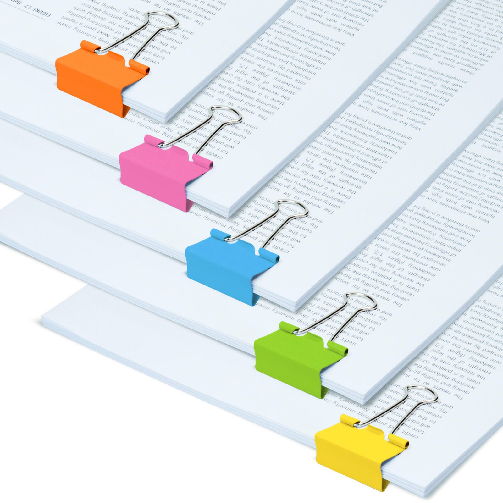 Die RAPESCO® Foldbackklammern sind praktische Büroklammern aus Metall, die sich durch ihre farbenfrohe Gestaltung auszeichnen. In einer Packung befinden sich zehn Klammern in den Farben blau, orange, pink, grün und gelb. Diese farbliche Sortierung erleichtert die Organisation und das schnelle Auffinden von Dokumenten.