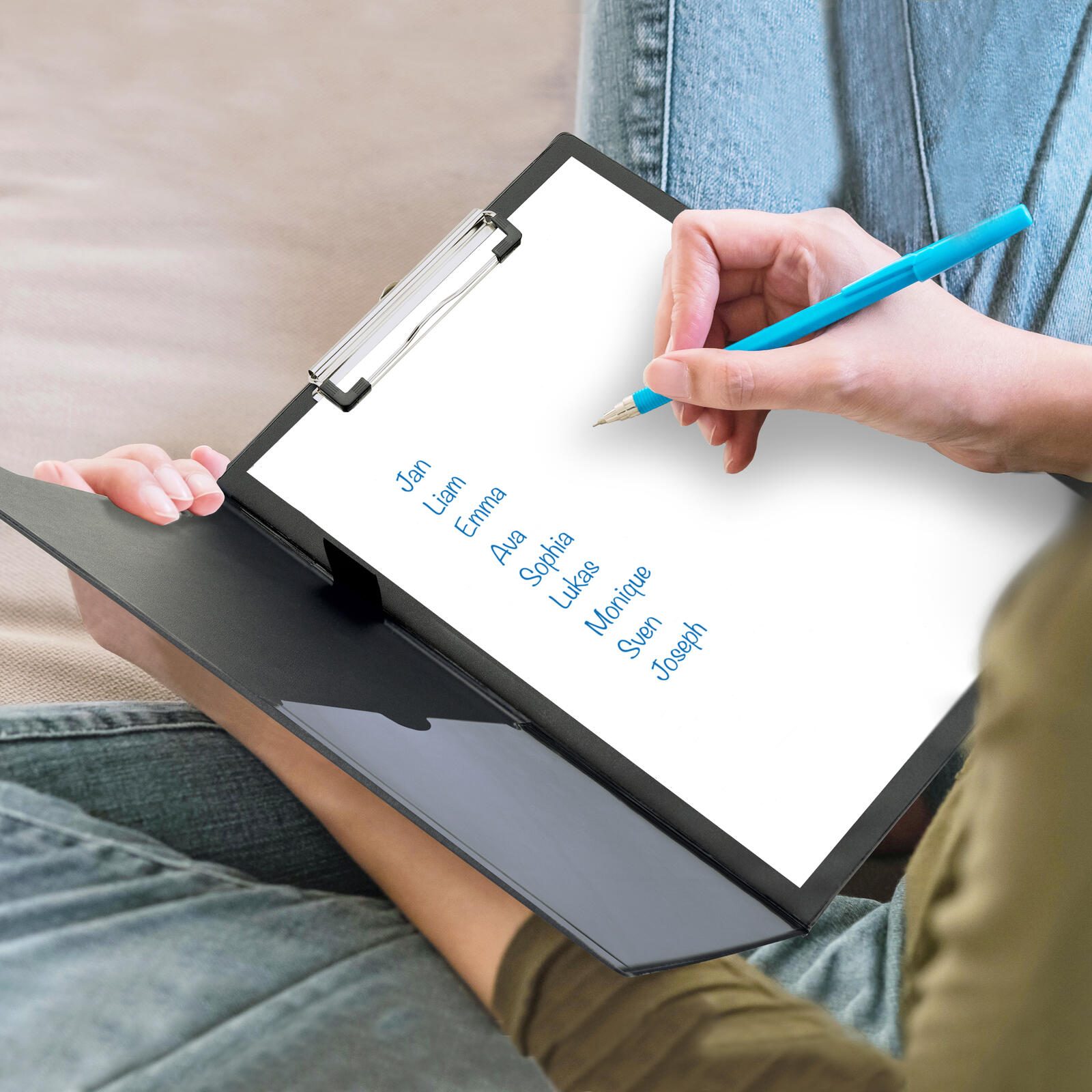 Für zusätzlichen Komfort bietet die Mappe eine einschiebbare Aufhängeöse, mit der sie leicht an Haken oder Nagel aufgehängt werden kann. Im Vorderdeckel befindet sich zudem eine Einstecktasche, die das Aufbewahren von losen Dokumenten ermöglicht. Diese Eigenschaften machen die RAPESCO® Klemmbrettmappe zu einem funktionalen und vielseitigen Bürohilfsmittel.