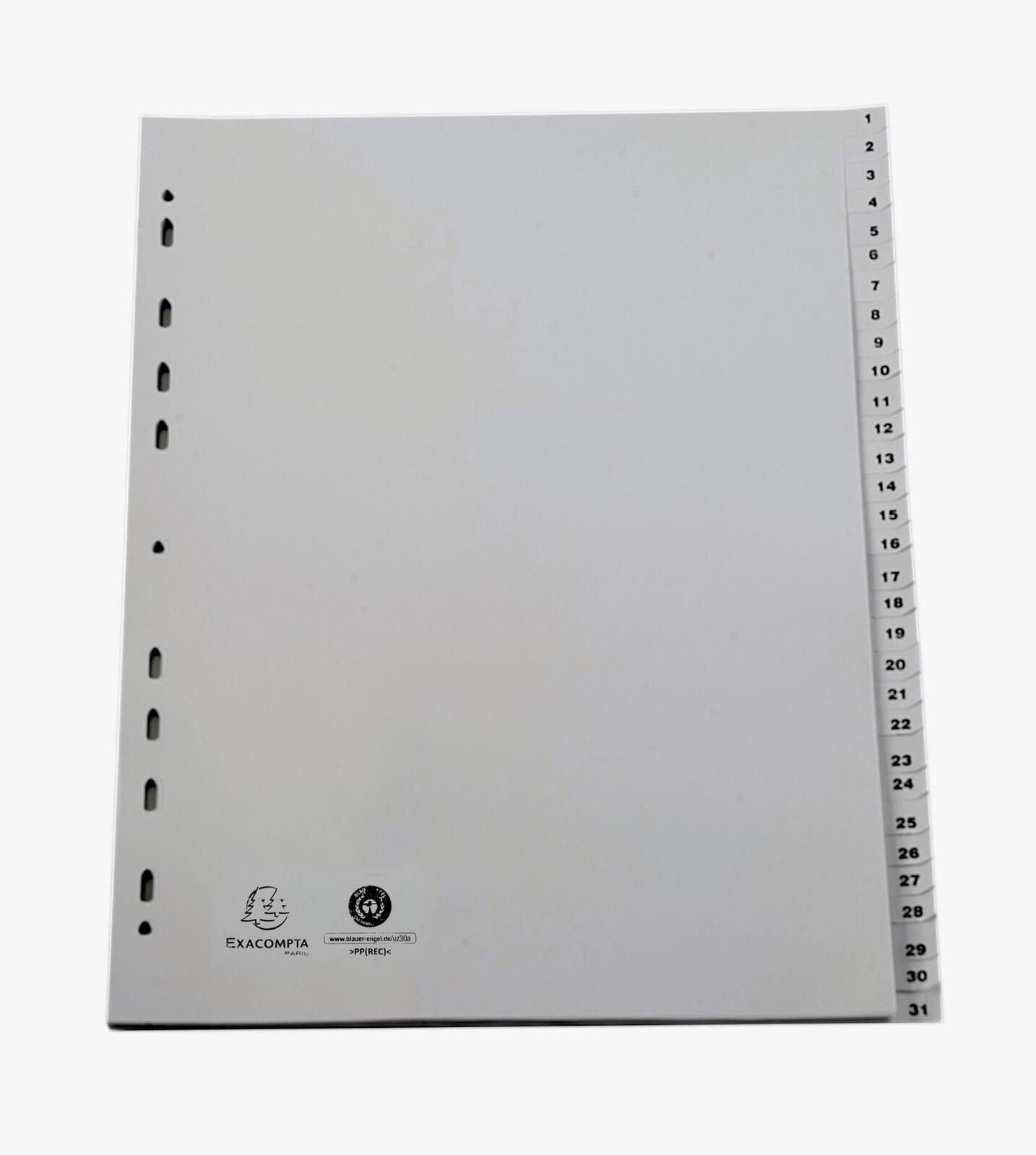 Das Exacompta Ordnerregister Vollformat in Überbreite 1-31 DIN A4 ist die ideale Lösung für alle, die Ordnung und Übersichtlichkeit in ihren Dokumenten schätzen. Hergestellt aus hochwertigem Polypropylen (PP) bietet dieses Register nicht nur Langlebigkeit, sondern auch einen ansprechenden grauen Farbton, der in jedem Büro oder Arbeitsumfeld gut aussieht.