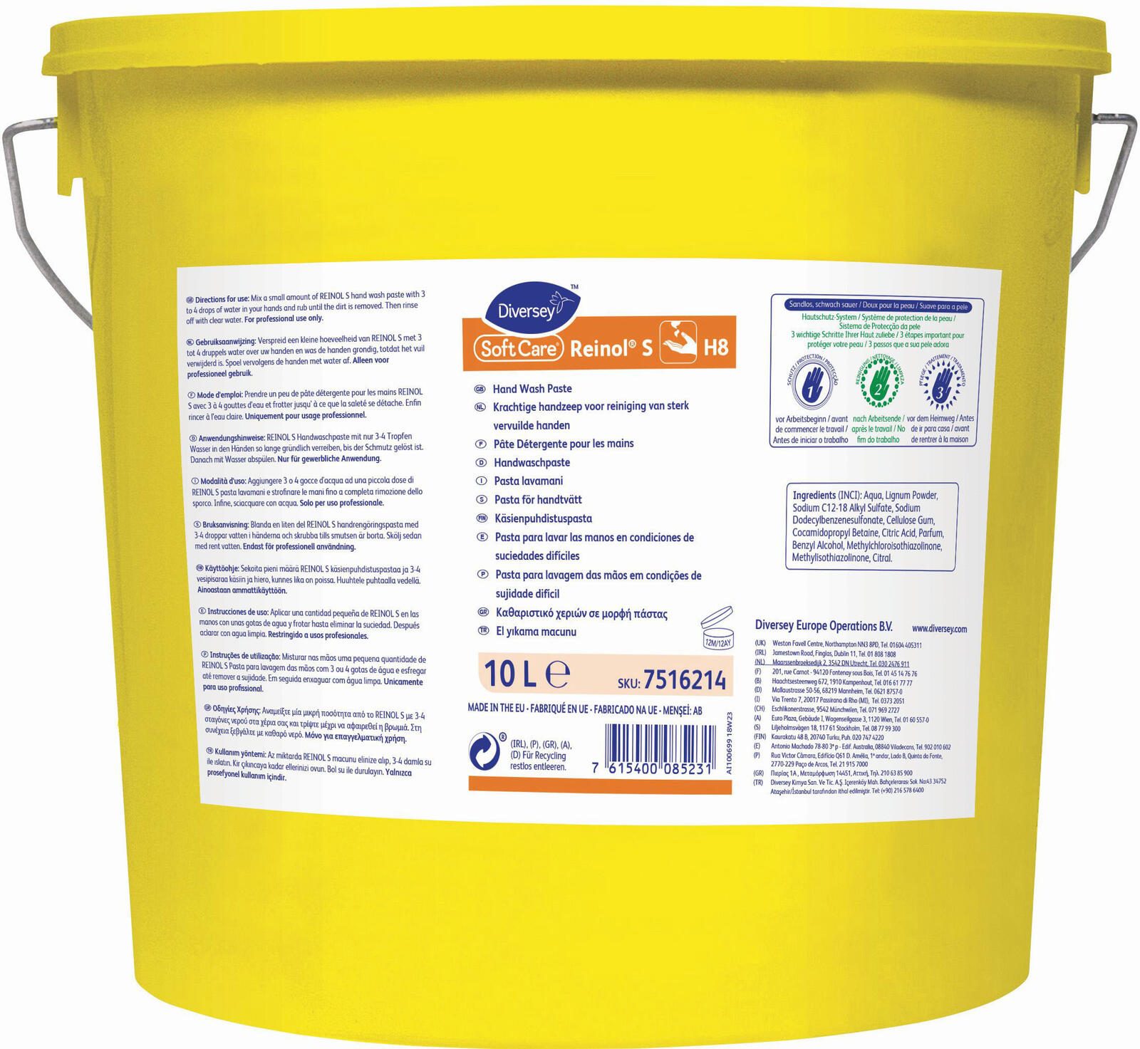 Die REINOL® S Handwaschpaste 10,0 l ist die ideale Lösung für eine gründliche und zugleich schonende Handreinigung. Mit ihrem pH-hautneutralen Wert sorgt sie dafür, dass deine Haut nicht austrocknet und angenehm weich bleibt, selbst bei häufigem Gebrauch. Diese Handwaschpaste ist speziell formuliert, um auch hartnäckige Verschmutzungen zu entfernen, ohne die Haut zu reizen. Der neutrale Duft der Handwaschpaste ist angenehm und unaufdringlich, sodass du dich nach der Anwendung frisch und sauber fühlst, ohne von starken Parfums abgelenkt zu werden. Die weiße Farbe der Paste verleiht ihr ein ansprechendes und sauberes Aussehen, das in jeder Umgebung gut aussieht. Mit einem Inhalt von 10,0 l ist der praktische Eimer nicht nur für den privaten Gebrauch geeignet, sondern auch ideal für Werkstätten, Industrie oder andere Bereiche, in denen eine effektive Handreinigung erforderlich ist. Die REINOL® S Handwaschpaste ist nicht nachfüllbar, was bedeutet, dass du immer einen frischen Eimer zur Hand hast, wenn du ihn benötigst. Die Produktreihe S von REINOL® steht für Qualität und Zuverlässigkeit in der Handreinigung. Vertraue auf die bewährte Formel, die deine Hände gründlich reinigt und gleichzeitig pflegt. Egal, ob du in der Werkstatt, im Garten oder in der Küche arbeitest, die REINOL® S Handwaschpaste ist der perfekte Begleiter für jeden, der Wert auf Sauberkeit und Hautfreundlichkeit legt.Technische Daten