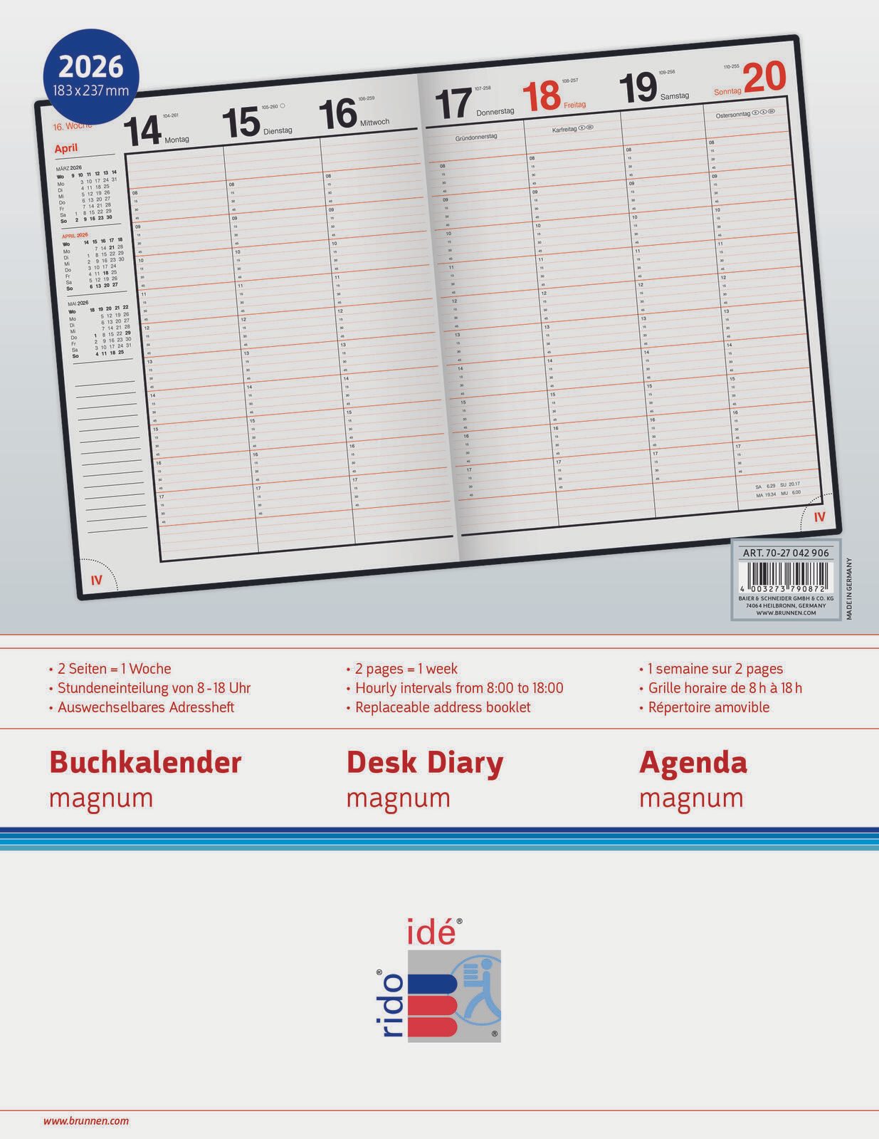 Der Kalender gehört zur Produktserie „magnum“ und wird vom Hersteller Rido Kalender mit Sitz in Hamburg, Deutschland, produziert. Die Kombination aus hochwertigem Material und durchdachtem Design macht den rido idé Buchkalender magnum zu einem zuverlässigen Begleiter für den Alltag.