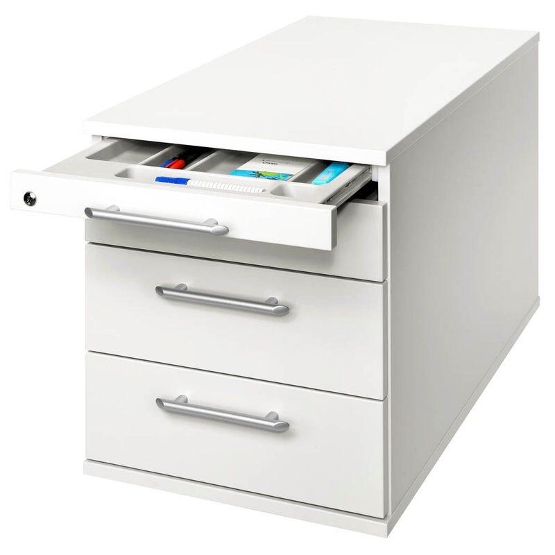 Der HAMMERBACHER Rollcontainer VTC30/W/W/RE misst 42,8 x 80,0 x 51,2 cm (BxTxH) und verfügt über drei geräumige Schubladen in Weiß. Dieser Rollcontainer aus der Solid Serie ist nicht nur praktisch, sondern auch ein echter Blickfang in jedem Arbeitsbereich. Die Verarbeitung des Rollcontainers ist hochwertig, sodass du lange Freude an diesem Möbelstück haben wirst.