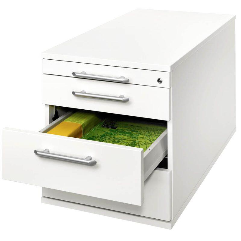 Der HAMMERBACHER Rollcontainer VTC30/W/W/RE in Weiß ist nicht nur funktional, sondern auch stilvoll und passt perfekt in jede moderne Büroumgebung. Mit Teleskop-Metall Kugelführungen ausgestattet, verfügt er über einen Selbsteinzug sowie einen Soft-Stopp Mechanismus, der ein leises Schließen der Schubladen gewährleistet. Die eingelassenen Rollen am Boden sorgen für eine mühelose Bewegung des Rollcontainers.
