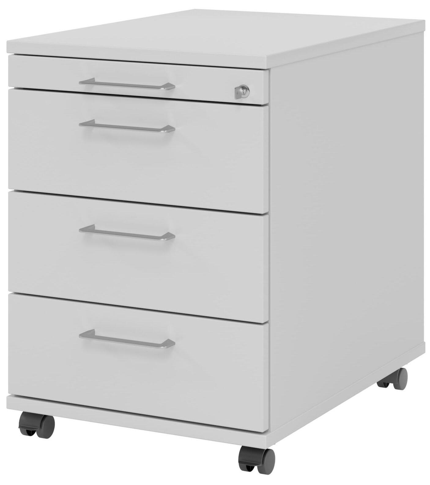 Der HAMMERBACHER Rollcontainer VAC30/5/5/BS in elegantem lichtgrau ist die perfekte Ergänzung für dein Büro oder Homeoffice. Mit einer kompakten Größe von 42,8 x 58,0 x 59,0 cm passt dieser Rollcontainer ideal unter den Schreibtisch oder in enge Räume, ohne dabei an Funktionalität zu verlieren. Dieser Rollcontainer bietet durch seine drei Schubladen ausreichend Stauraum für Dokumente, Büromaterialien und persönliche Gegenstände. Die Schubladen sind mit einem Selbsteinzug und Soft-Stopp ausgestattet, was ein sanftes und geräuschloses Schließen ermöglicht. So bleibt dein Arbeitsumfeld stets ruhig und ordentlich. Die robuste Konstruktion aus Spanplatte sorgt für Langlebigkeit und Stabilität, während der Bügelgriff aus Stahl nicht nur funktional, sondern auch ästhetisch ansprechend ist. Die lichtgraue Farbgebung verleiht dem Rollcontainer eine moderne und zeitlose Optik, die sich harmonisch in jede Büroeinrichtung einfügt. Dieser Rollcontainer ist nicht nur praktisch, sondern auch ein stilvolles Möbelstück, das Ordnung und Übersichtlichkeit in deinen Arbeitsbereich bringt. Mit dem HAMMERBACHER Rollcontainer VAC30/5/5/BS entscheidest du dich für Qualität und durchdachtes Design, das deinen Bedürfnissen im Arbeitsalltag gerecht wird.Technische Daten