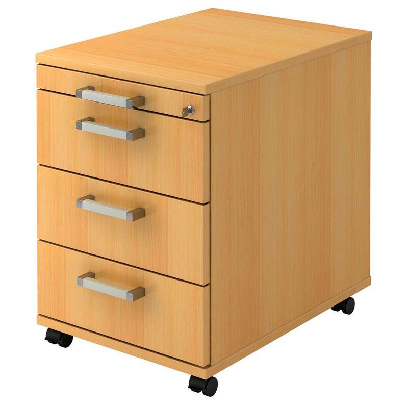 Der Rollcontainer besteht aus hochwertiger Spanplatte und hat eine ansprechende buche-buche Farbgebung, die in jedem Raum gut zur Geltung kommt. Die Griffausführung mit Bügelgriffen sorgt nicht nur für eine komfortable Nutzung, sondern verleiht dem Rollcontainer auch ein modernes Erscheinungsbild.