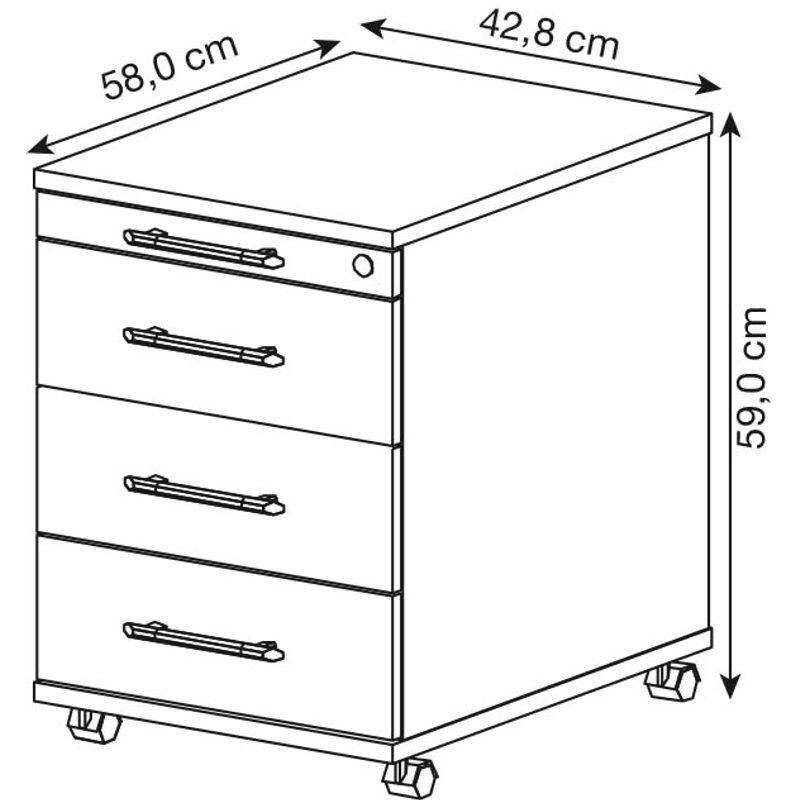 Der Rollcontainer besteht aus hochwertiger Spanplatte und verfügt über einen stilvollen Relinggriff. Mit Maßen von 42,8 x 58,0 x 59,0 cm bietet er ausreichend Stauraum, ohne dabei sperrig zu wirken. Die 3 Schubladen ermöglichen eine übersichtliche Organisation deiner Unterlagen und Utensilien.
