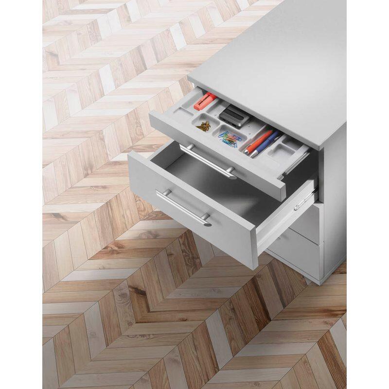 Der Rollcontainer besteht aus strapazierfähiger Spanplatte und ist daher langlebig und stabil. Der Relinggriff ermöglicht ein einfaches Öffnen und Schließen der Schubladen. In dem zeitlosen Farbton lichtgrau fügt sich der Rollcontainer harmonisch in jedes Raumkonzept ein.