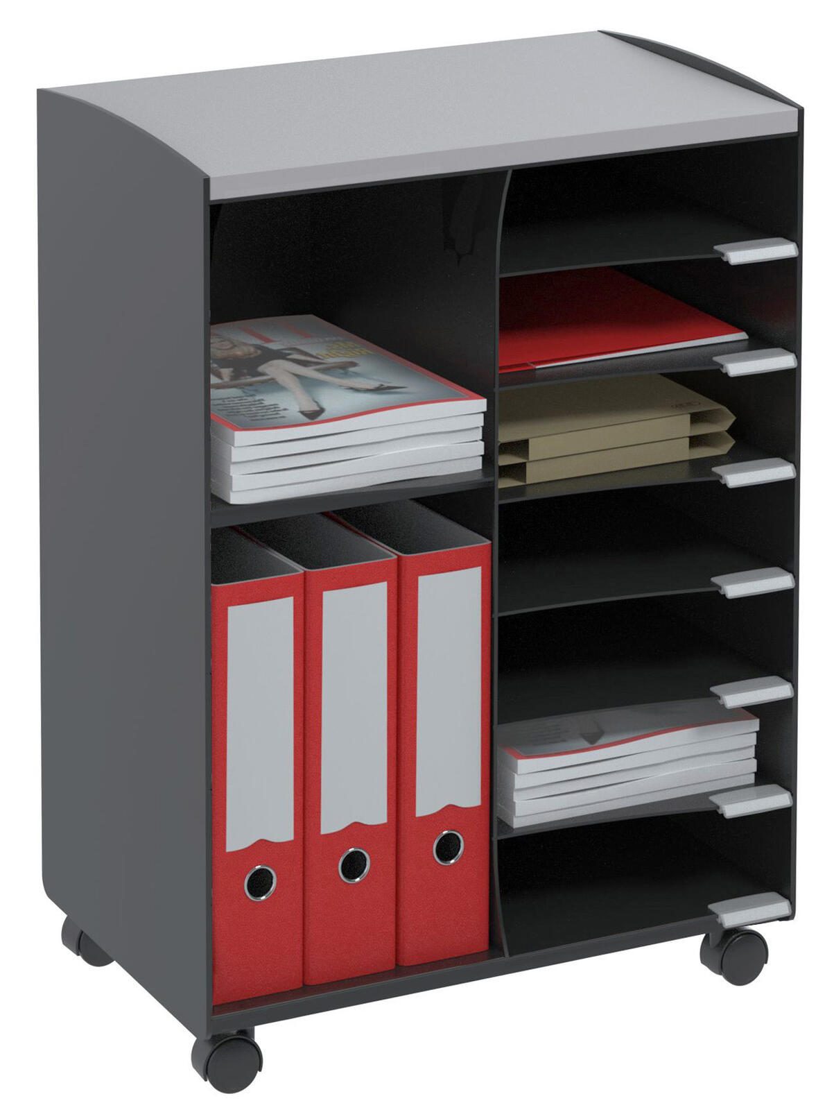 Der PAPERFLOW Bürowagen ist die perfekte Lösung für dein Büro, um Ordnung und Effizienz zu steigern. Mit seinen kompakten Abmessungen von 51,4 x 33,0 x 72,0 cm passt dieser praktische Rollwagen ideal in jede Arbeitsumgebung. Seine elegante schwarze Farbe verleiht deinem Büro ein modernes und professionelles Aussehen, während das robuste Stahlgestell für Stabilität und Langlebigkeit sorgt. Der Bürowagen verfügt über neun Fächer, die jeweils eine Tragkraft von bis zu 3 kg bieten. Damit kannst du problemlos Akten, Dokumente oder Büromaterialien organisieren und transportieren. Die durchdachte Anordnung der Fächer ermöglicht einen schnellen Zugriff auf deine Unterlagen, sodass du jederzeit effizient arbeiten kannst. Ob im Homeoffice oder im klassischen Büro, der PAPERFLOW Bürowagen ist ein vielseitiger Begleiter. Er bietet nicht nur ausreichend Stauraum, sondern lässt sich dank des leichten Gestells auch mühelos bewegen. So kannst du ihn ganz nach Bedarf an den gewünschten Standort bringen, ohne viel Aufwand. Die hochwertige Verarbeitung und das zeitlose Design machen diesen Bürowagen zu einem unverzichtbaren Möbelstück für jeden Arbeitsplatz. Mit dem PAPERFLOW Bürowagen investierst du in ein Produkt, das Funktionalität und Stil vereint und dir hilft, deine Arbeitsabläufe zu optimieren.Technische Daten