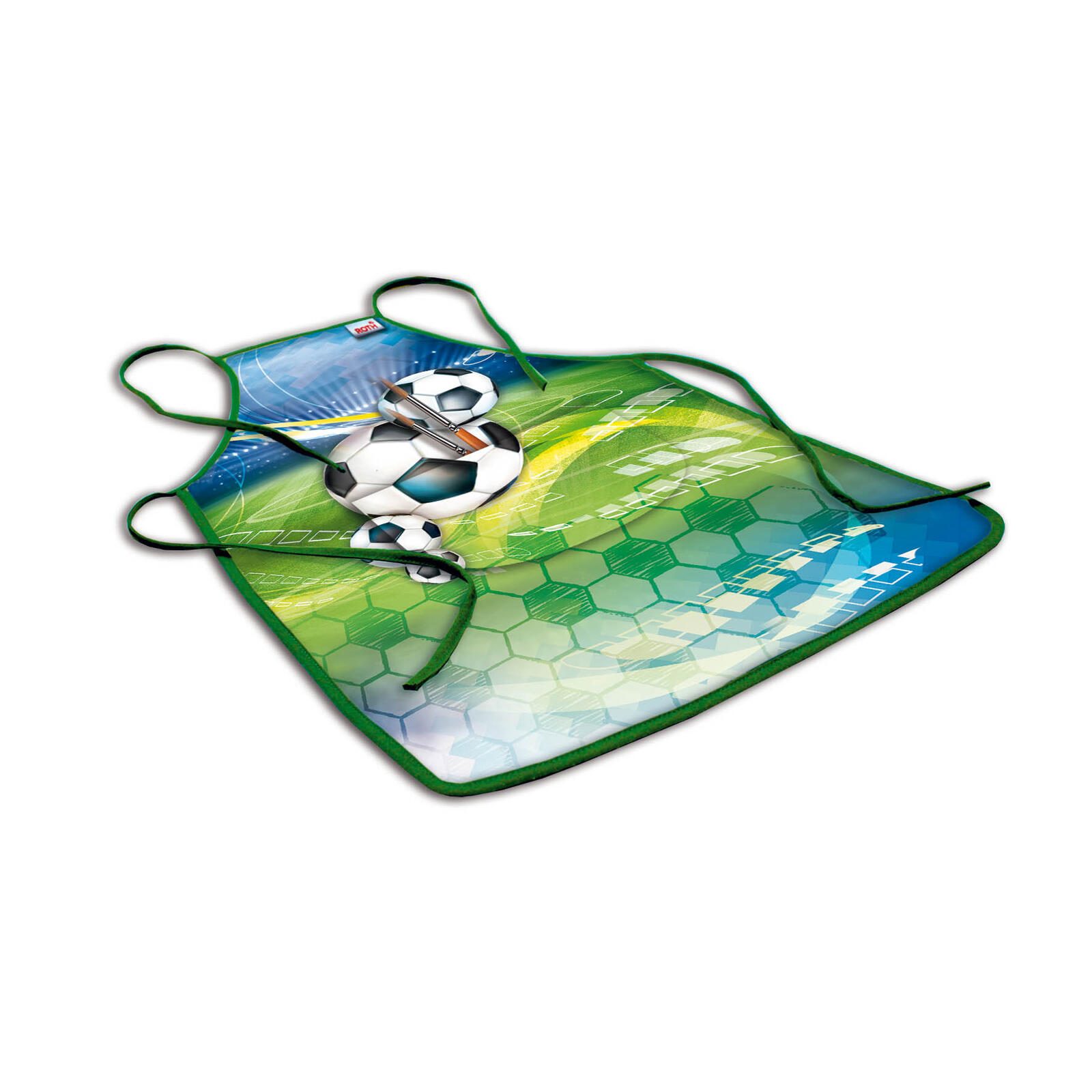 Das Design in den ansprechenden Farben Blau und Grün mit einem Fußball-Motiv macht die Schürze besonders attraktiv für junge Fußballfans. Der Verschluss erfolgt über praktische Bänder, die eine individuelle Anpassung an verschiedene Körpergrößen ermöglichen und somit einen bequemen Sitz garantieren.