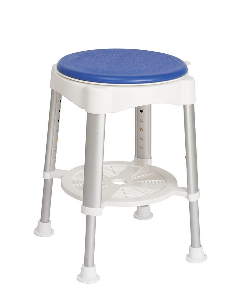 Der drehbare Sitz ermöglicht eine flexible Nutzung und erleichtert das Hinsetzen und Aufstehen. Die Sitzfläche ist mit einem Polyurethan-Schaum gepolstert, der Komfort bietet und gleichzeitig pflegeleicht ist. Die verwendeten Materialien umfassen Aluminium, Polypropylen, Gummi und Polyurethan-Schaum, die zusammen für Langlebigkeit und eine einfache Reinigung sorgen.