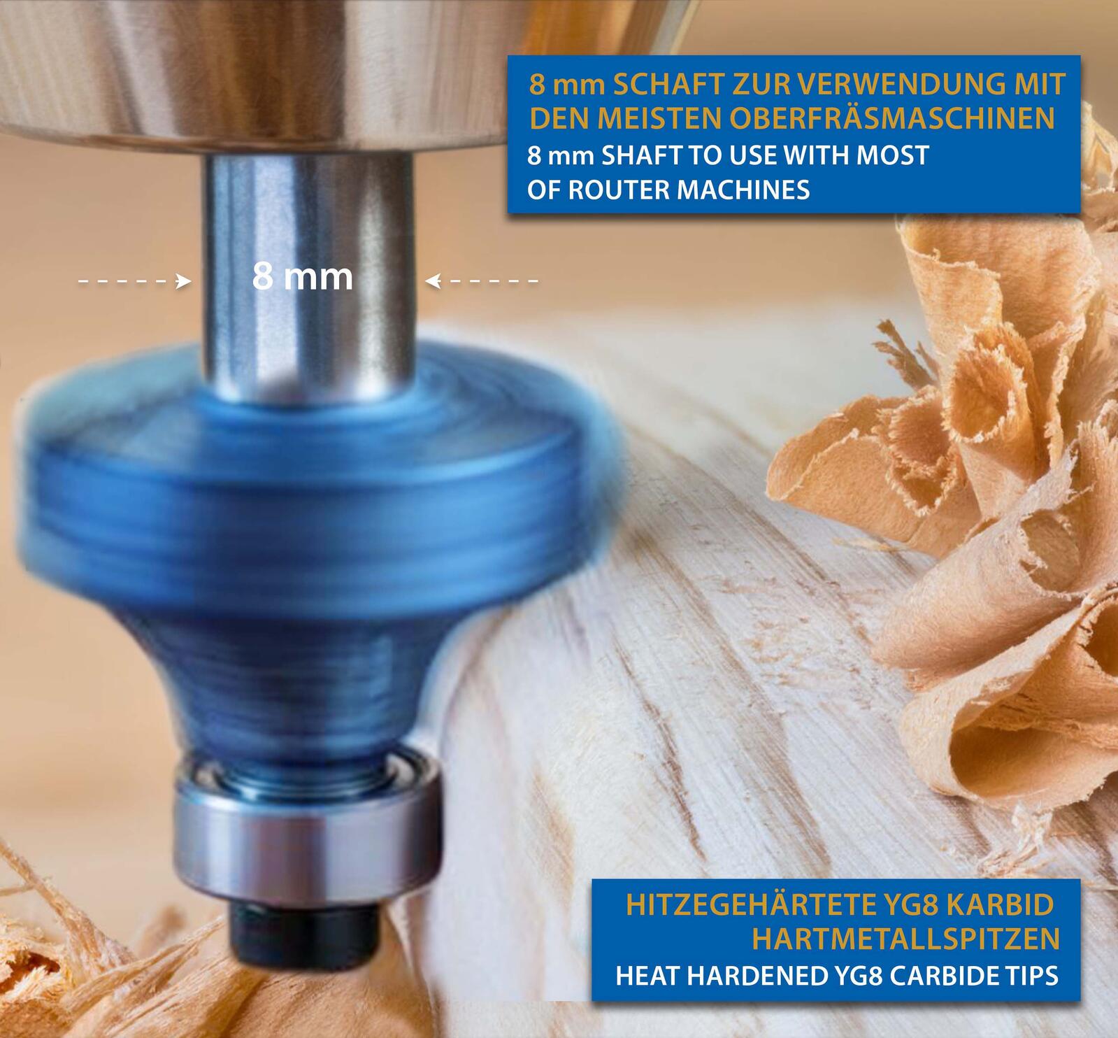 Die Fräser sind mit langlebigen, extra scharfen Wolframkarbid-Klingen ausgestattet, die eine hohe Schnittqualität und lange Standzeiten garantieren. Dieses Material sorgt dafür, dass die Werkzeuge auch bei intensiver Nutzung ihre Schärfe behalten und somit eine effiziente und saubere Bearbeitung ermöglichen.