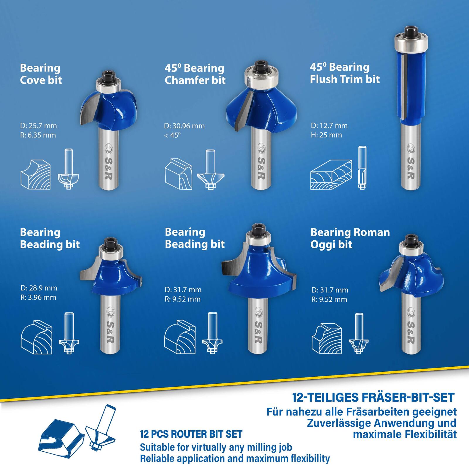 Das S&R Fräser-Set 12-teilig bietet eine umfassende Auswahl an hochwertigen Fräswerkzeugen, die speziell für die Bearbeitung verschiedenster Holzarten entwickelt wurden. Mit einem Schaftdurchmesser von 8,00 mm ist das Set ideal für den Einsatz an handelsüblichen Fräsmaschinen geeignet und gewährleistet eine stabile und präzise Führung während der Arbeit.