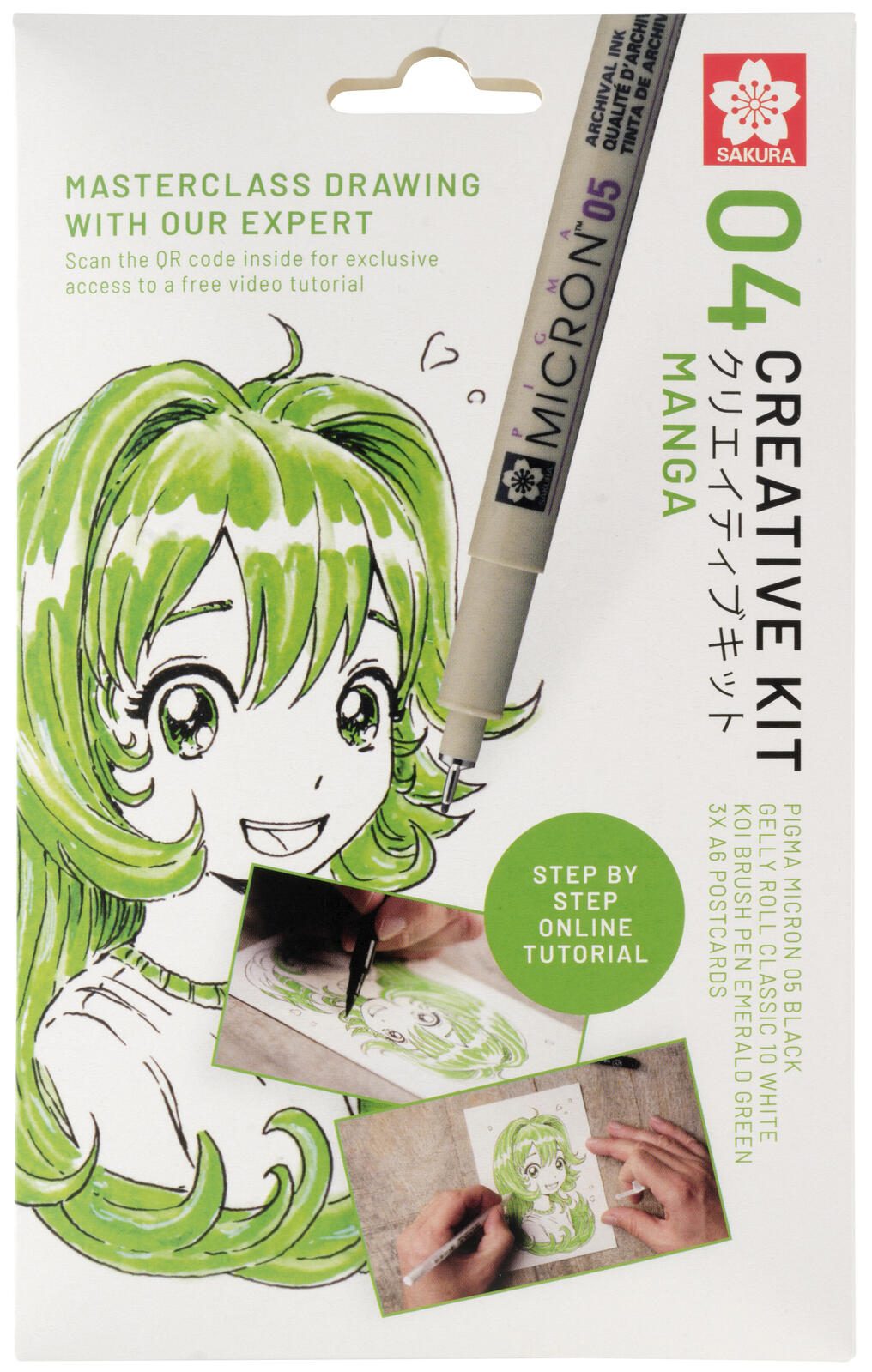 Im Lieferumfang enthalten sind ein Pigma Micron 05 Fineliner in Schwarz, ein Gelly Roll Basic 10 in Weiß sowie ein Koi Coloring Pinselstift in Smaragdgrün. Ergänzt wird das Set durch drei Postkarten aus Mixed Media Papier im Format DIN A6, die als Zeichenunterlage oder für eigene Kunstwerke genutzt werden können. Zusätzlich gibt es einen QR-Code, der zu einer kostenlosen Video-Anleitung führt und somit den Einstieg in das Manga-Zeichnen erleichtert.