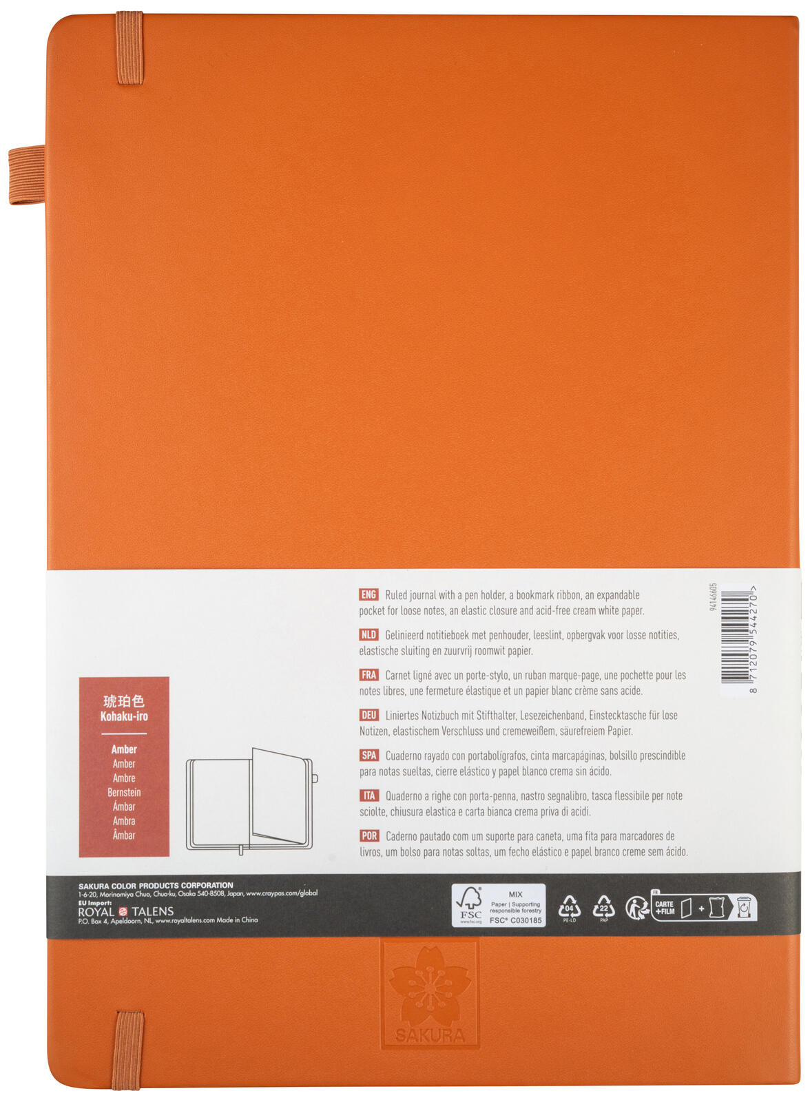 Das Notizbuch ist mit einem Einband aus Öko-Leder ausgestattet, der nicht nur eine ansprechende Optik in bernsteinfarbener Gestaltung bietet, sondern auch für eine robuste und langlebige Nutzung sorgt. Die Bindung erfolgt durch eine Fadensiegelung, die das sichere Zusammenhalten der Seiten gewährleistet. Ein praktischer Gummizugverschluss sorgt dafür, dass das Buch sicher verschlossen bleibt und der Inhalt geschützt ist.