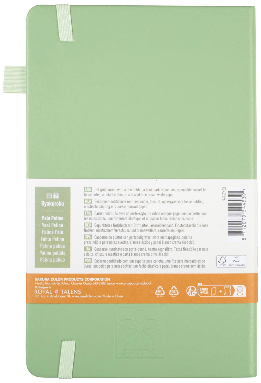 Der Einband des Notizbuchs besteht aus Öko-Leder in der Farbe pale patina, was eine natürliche und nachhaltige Materialwahl darstellt. Für die sichere Verschließbarkeit sorgt ein Gummizug, der das Buch zuverlässig zusammenhält. Die Bindung erfolgt durch eine Fadensiegelung, die für eine stabile und langlebige Verarbeitung sorgt.