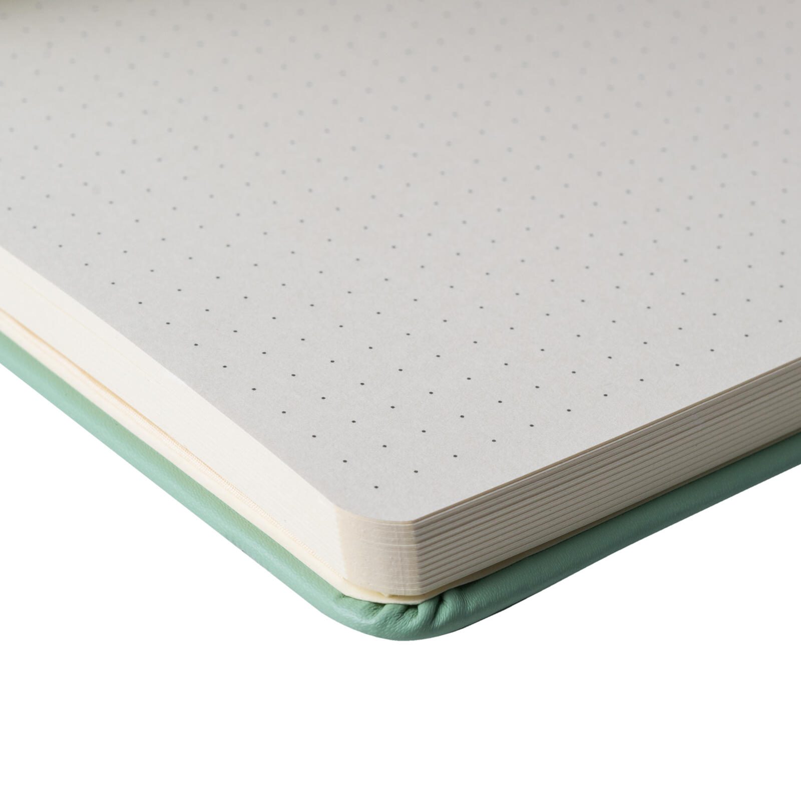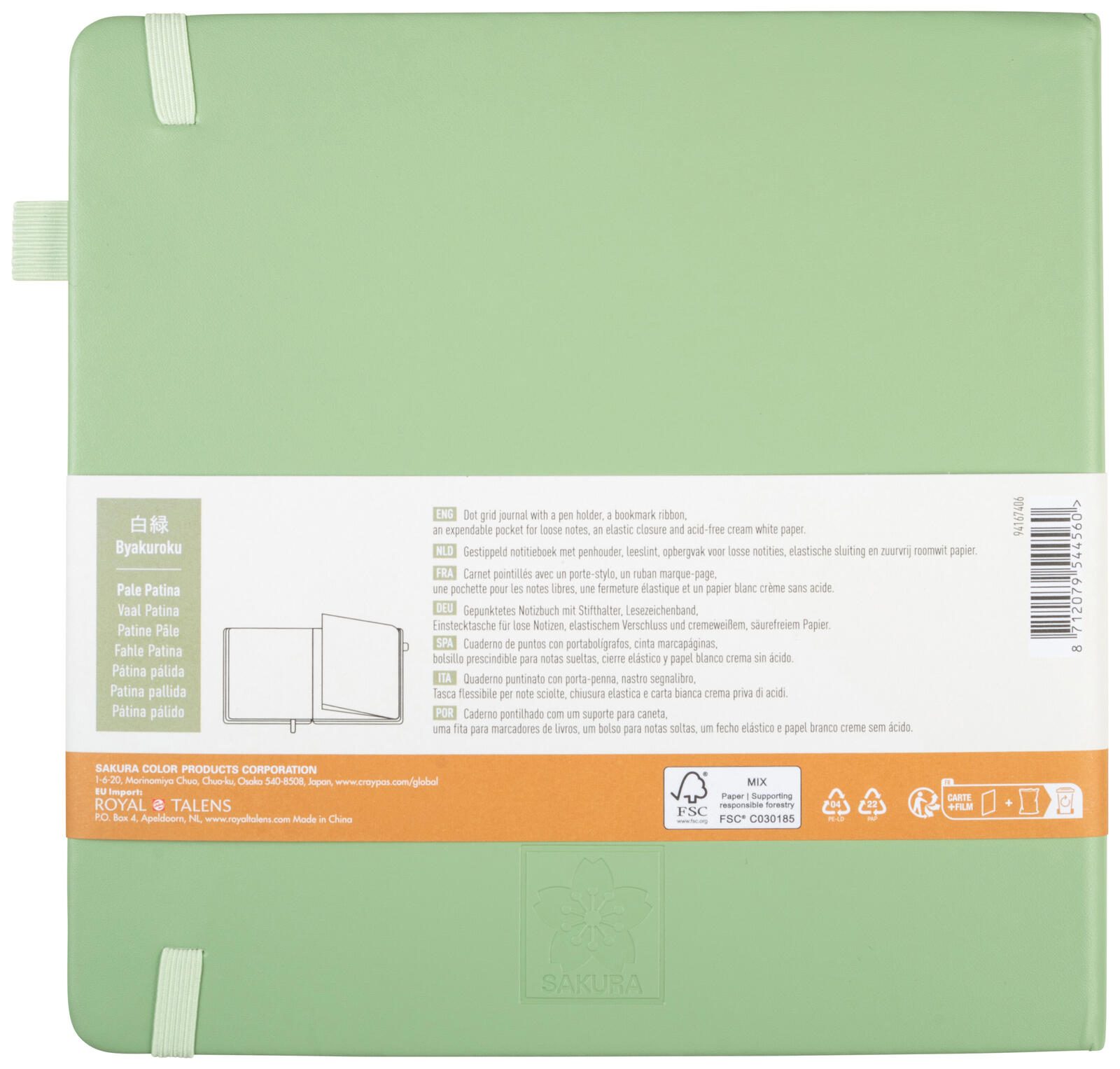 Das Notizbuch ist in einem eleganten Farbton namens „pale patina“ gehalten und verfügt über einen Bezug aus Öko-Leder. Dieses Material verbindet eine ansprechende Optik mit nachhaltigen Eigenschaften. Die Bindung erfolgt mittels Fadensiegelung, was für eine stabile und langlebige Verarbeitung sorgt. Der Verschluss wird durch einen praktischen Gummizug gewährleistet, der das Notizbuch sicher zusammenhält.